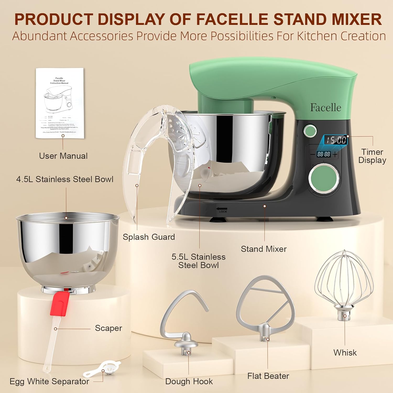 • Висококачествени купи за смесване 5,5 л + 4,5 л: Електрическият кухненски миксер Facelle е оборудван с две купи, изработени от неръждаема стомана, безопасна за храни. Можем лесно да сменим купата с нова, без да се налага да чакаме почистването ѝ при печене. Специалният дизайн за подреждане осигурява пестене на място за съхранение, като подреждате две купи една в друга. Те са добри помощници при приготвяне на храна, миене и съхранение на зеленчуци или едро смесване.