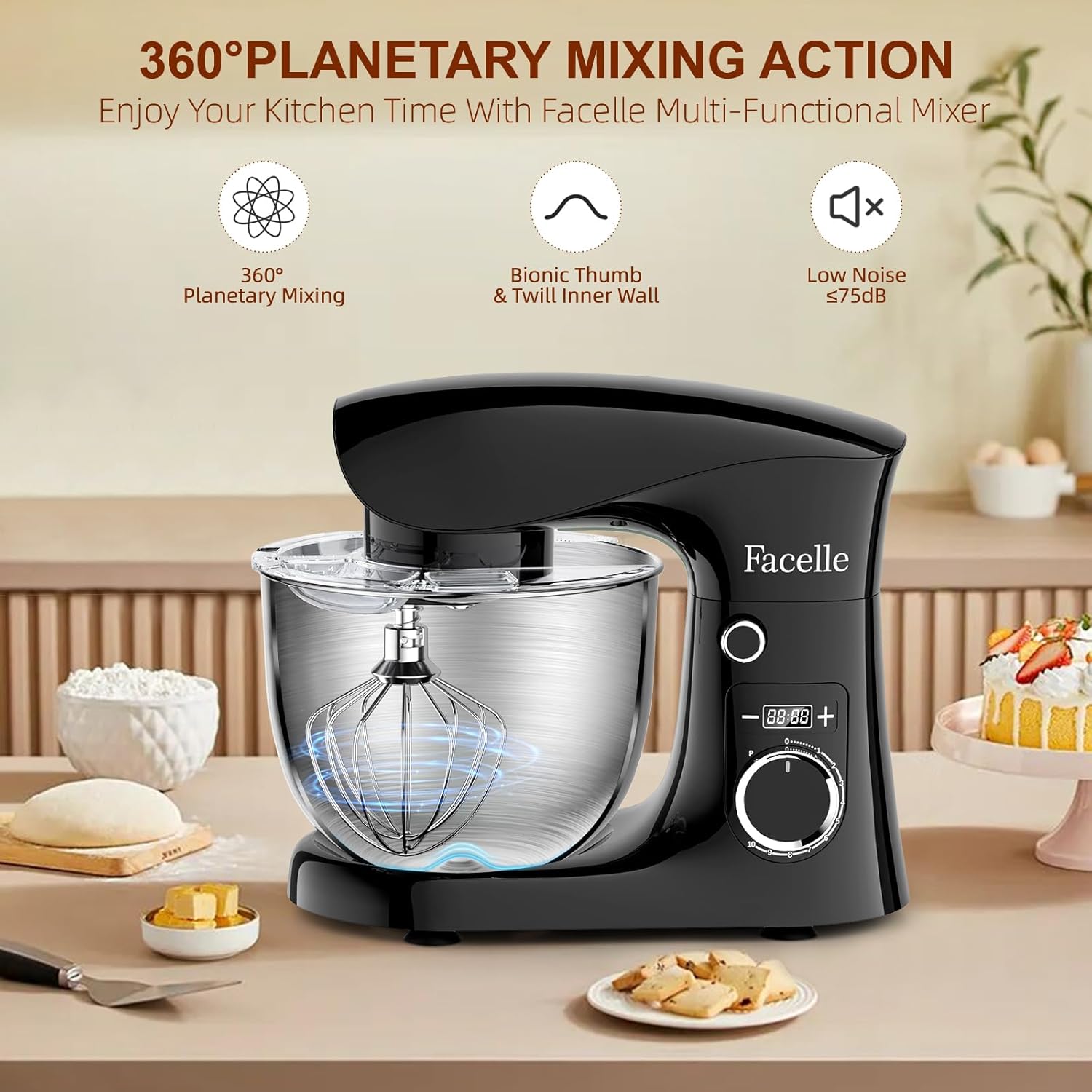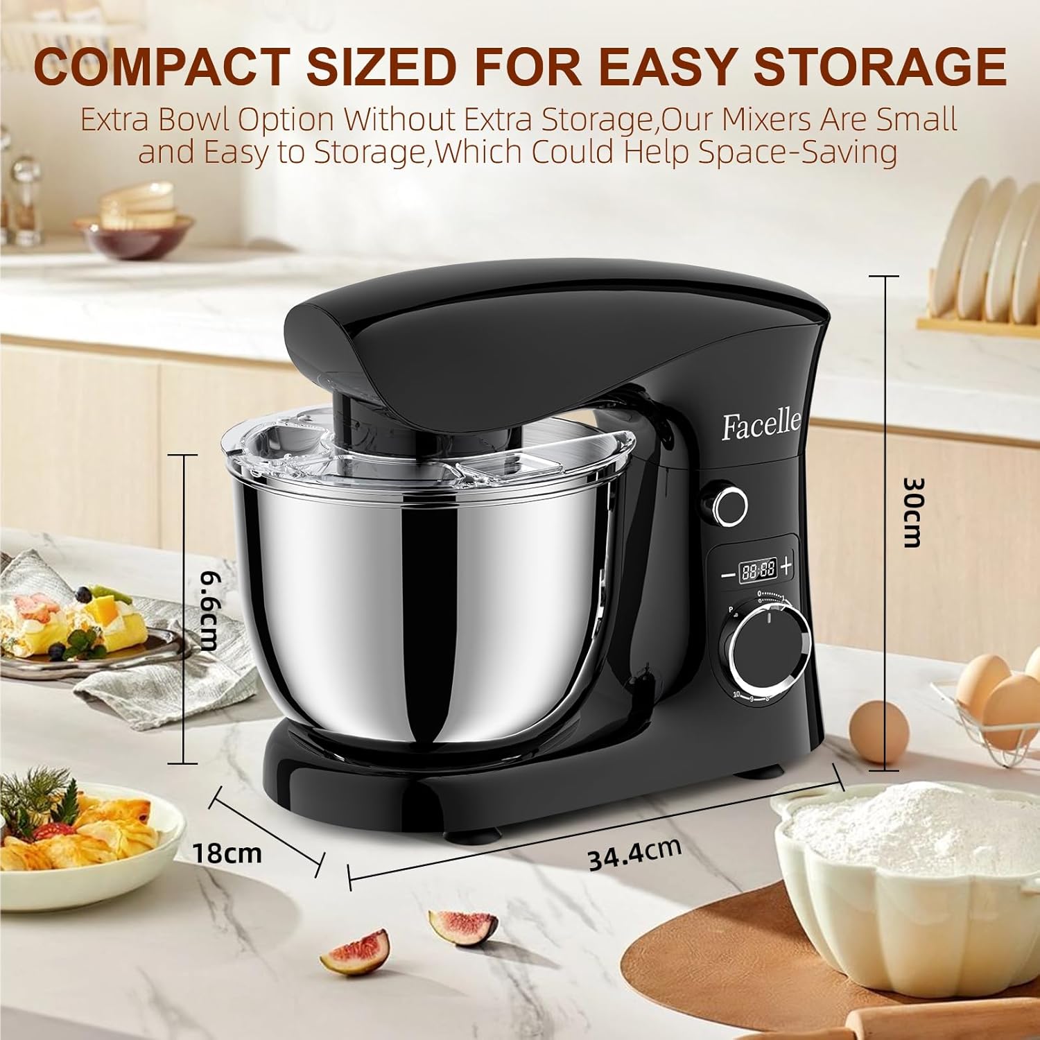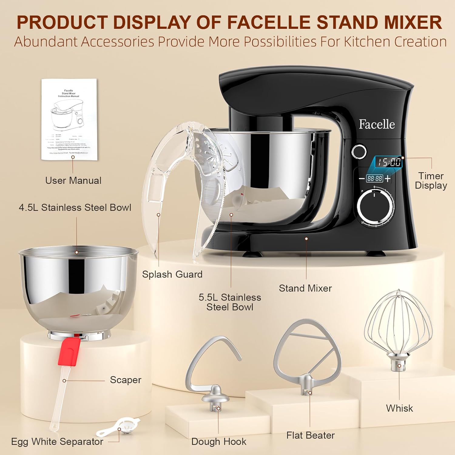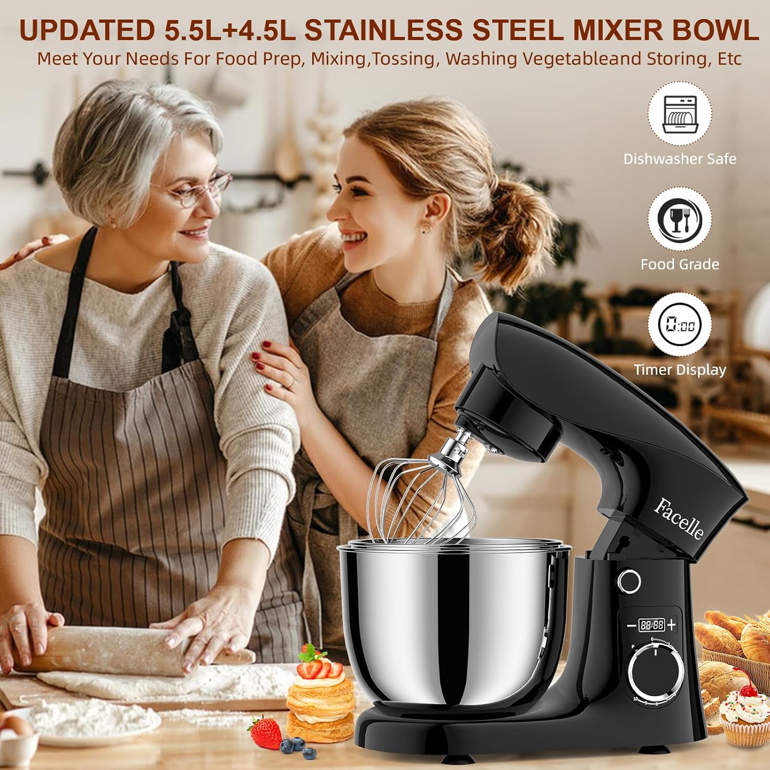 Машина за месене на тесто Facelle 1500 W | Машина за тесто 5.5L и 4.5L | Ниско ниво на шум | Машина за месене на тесто 10+P с кука за смесване, кука за тесто, бъркалка и предпазител от пръски