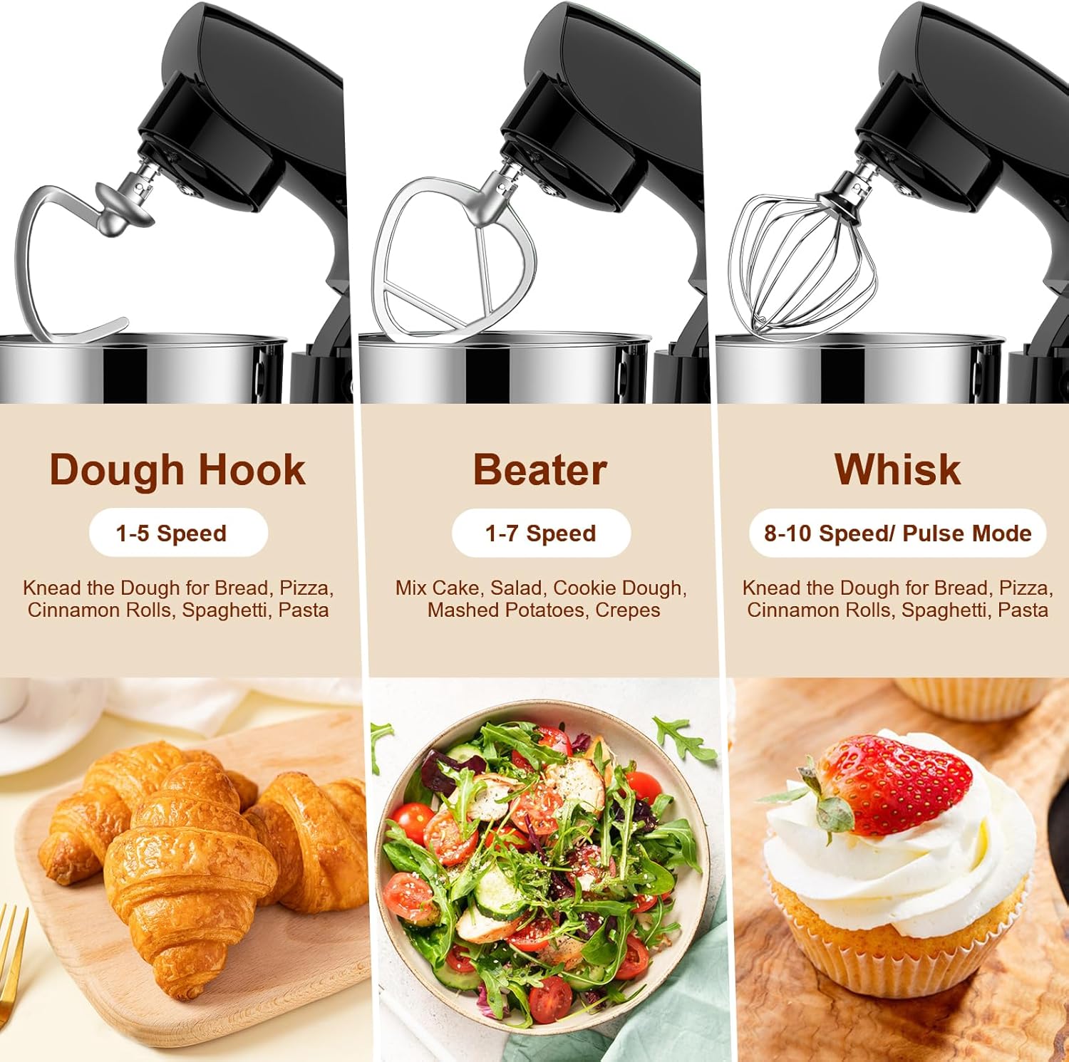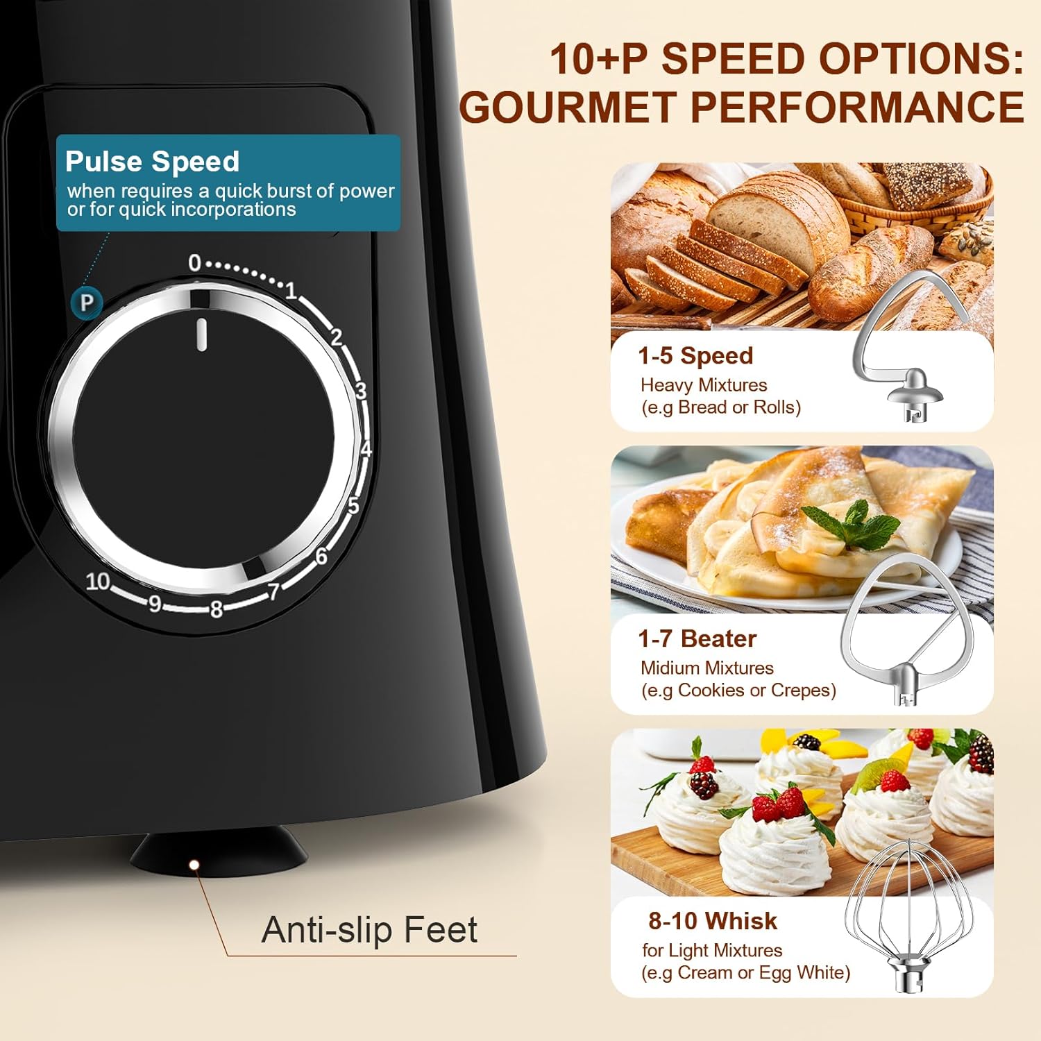 • Подобрени аксесоари и подходящи за съдомиялна машина: подобрена антиоксидантна тефлонова кука за тесто и плоска бъркалка, бъркалките от неръждаема стомана са по-здрави и издръжливи. Всички приставки за кухненски робот са подходящи за съдомиялна машина и могат да се почистват бързо и лесно. Допълнителен сепаратор за яйца и силиконова стъргалка осигуряват перфектен и професионален резултат от смесването всеки път.