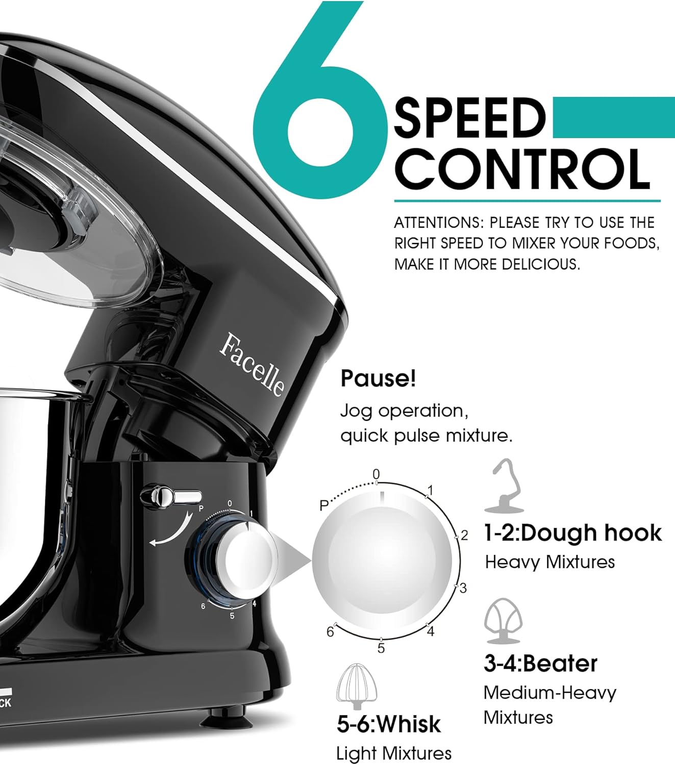 6 adjustable speeds and pulse function for all your food preparation or recipe requirements, and the LED power indicator can help you choose the appropriate speed. Please follow the instructions to fully use it. For example, the dough hook is used at a speed of 1-3 for heavier doughs, such as baking bread, pizza and other heavier doughs.