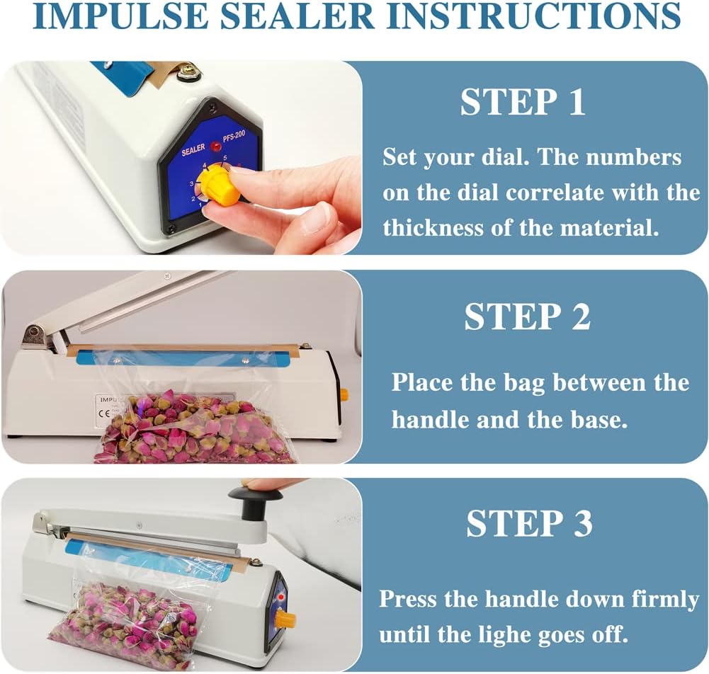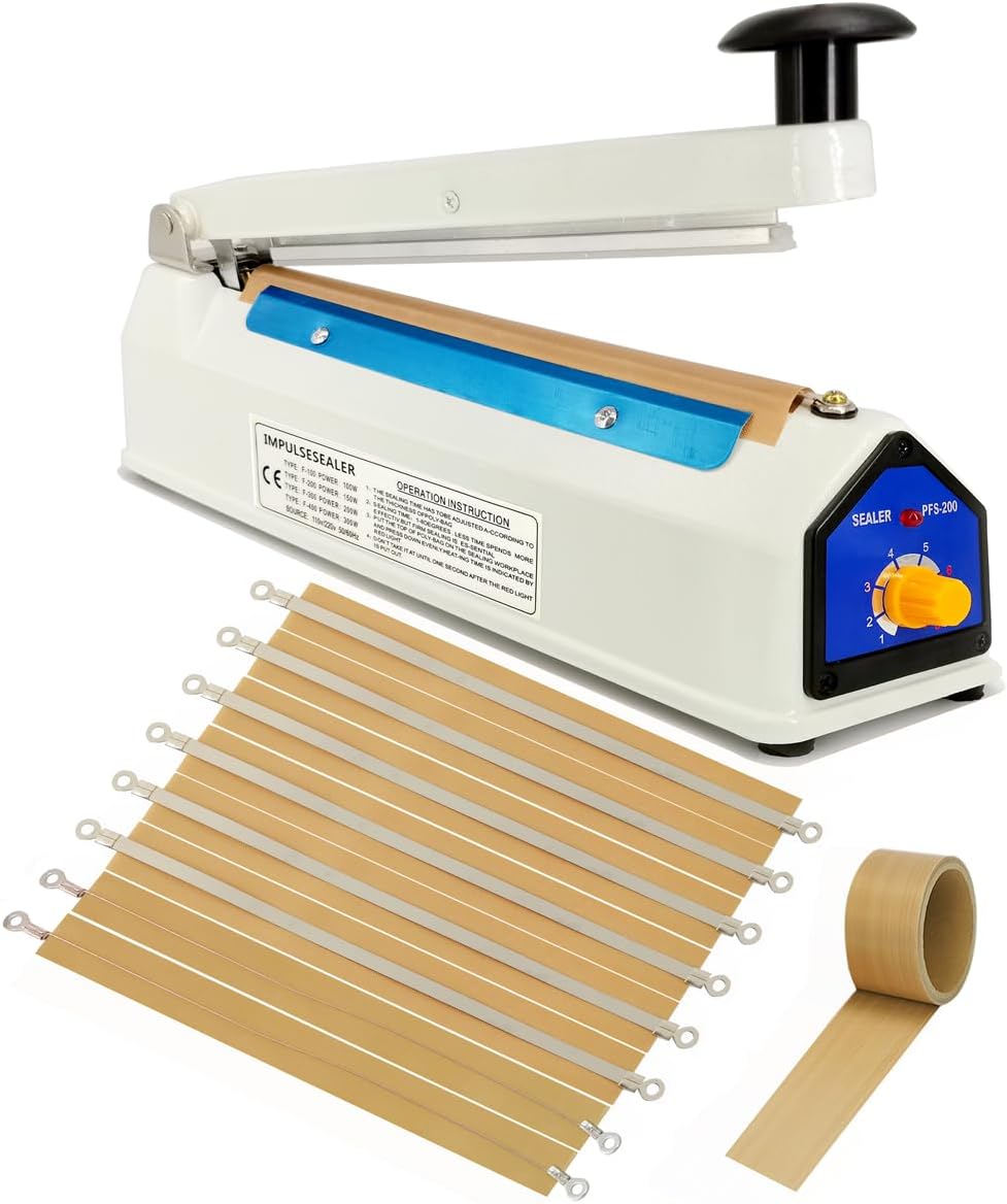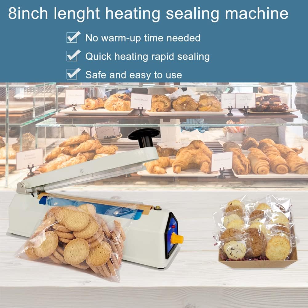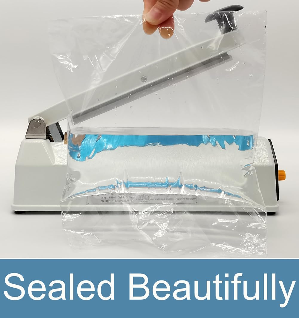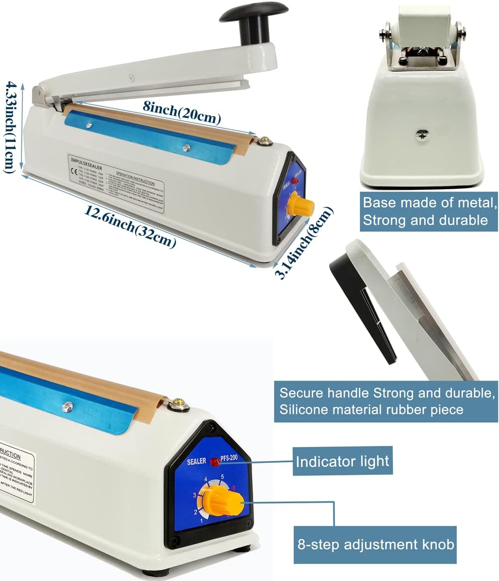 • Дизайн: машина за термозапечатване с вградено прецизно управление на веригата. Силиконова изолационна лента. 8-степенен регулируем таймер, подходящ за торби с различна дебелина и материали. Вслушахме се в нашите клиенти и променихме захранващия кабел на 1,8 метра, елиминирайки използването на удължителен кабел за повечето приложения. и увеличени 5-метрови тефлонови ленти за висока температура, по-дълъг експлоатационен живот, елиминирайки неудобството от честото закупуване на аксесоари.