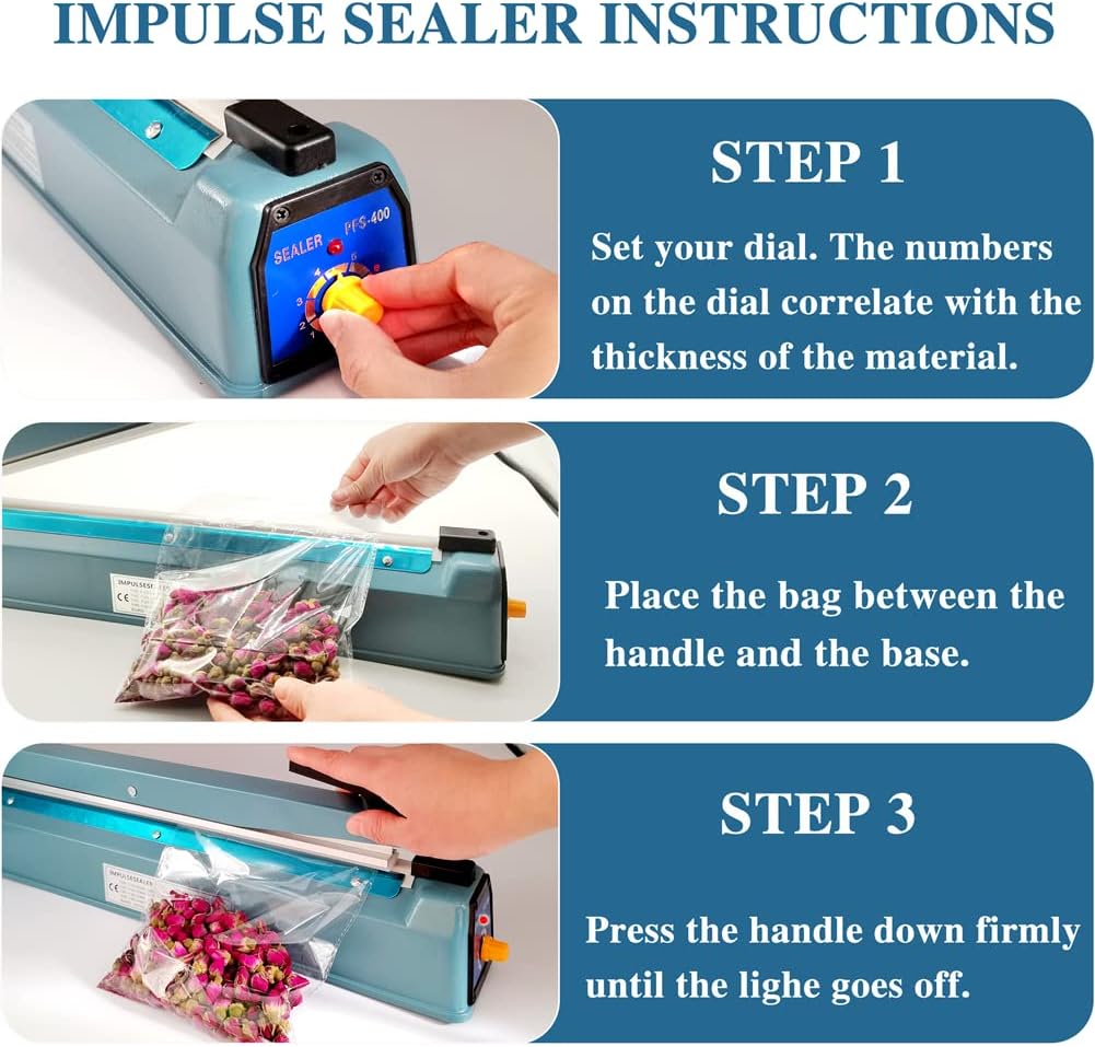 • Дизайн: машина за термозапечатване с вградено прецизно управление на веригата. Силиконова изолационна лента. 8-степенен регулируем таймер, подходящ за торби с различна дебелина и материали. Вслушахме се в нашите клиенти и променихме захранващия кабел на 1,8 метра, елиминирайки използването на удължителен кабел за повечето приложения. и увеличени 5-метрови тефлонови ленти за висока температура, по-дълъг експлоатационен живот, елиминирайки неудобството от честото закупуване на аксесоари.