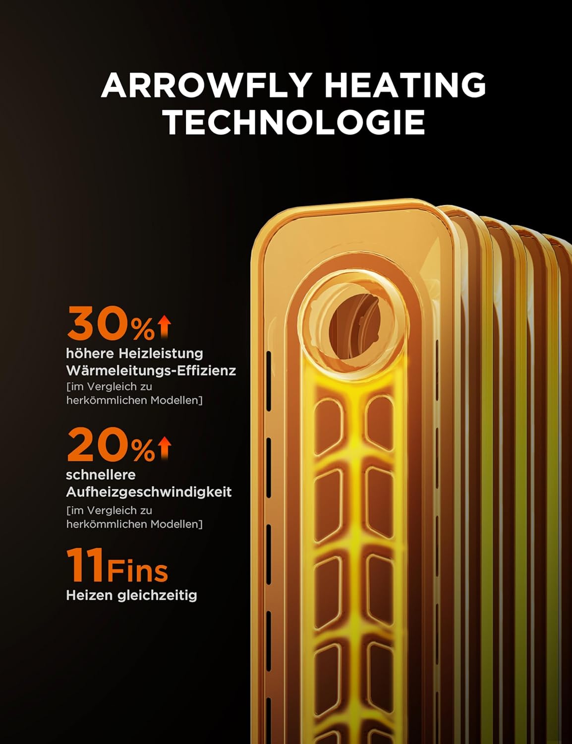 • БЪРЗО И ЕФЕКТИВНО ЗАГРЯВАНЕ Този радиатор е оборудван с иновативна отоплителна технология Arrowfly с маслено пълнени кръгове тип „рибена кост“ за високоефективно отопление. 11-ребреният радиатор бързо повишава стайната температура и осигурява равномерно разпределение на топлината в големи помещения - за надеждна и уютна топлина, когато имате нужда от нея.