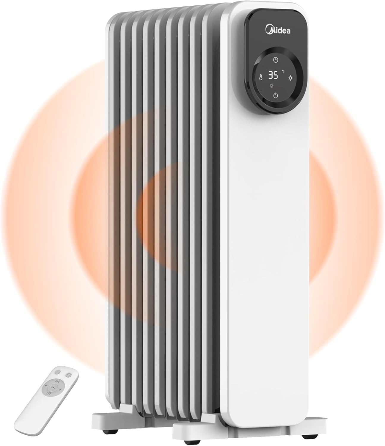 Маслен радиатор Midea, преносим електрически нагревател 2000 W, 11 ребра, с въртящ се контрол и регулируем термостат, 3 степени на топлина, защита от накланяне и прегряване, ултра тих в офиса и дома.