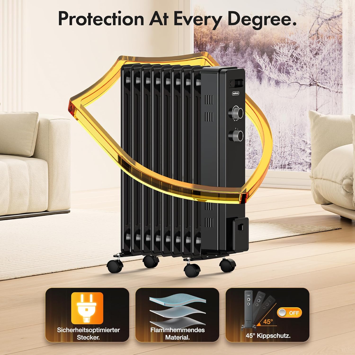Маслен радиатор VonHaus, 9 ребра, радиаторен нагревател, електрически, преносим, ​​свободностоящ, 2000 W за дома, офиса, регулируем термостат, 3 степени на отопление, 4 колела, 1,5 м кабел (черен)