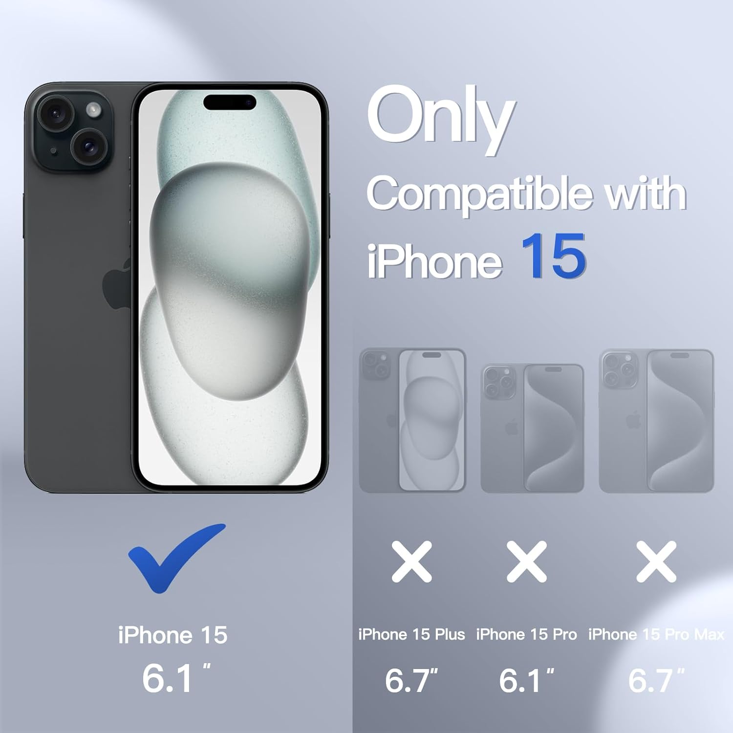 • [Тънък профил] Подходящ само за iPhone 15 6.1 инча. Ние се грижим за естетиката и защитата. Този калъф няма да направи телефона ви да изглежда обемист и няма да повлияе на съвместимостта с безжичното зарядно устройство.