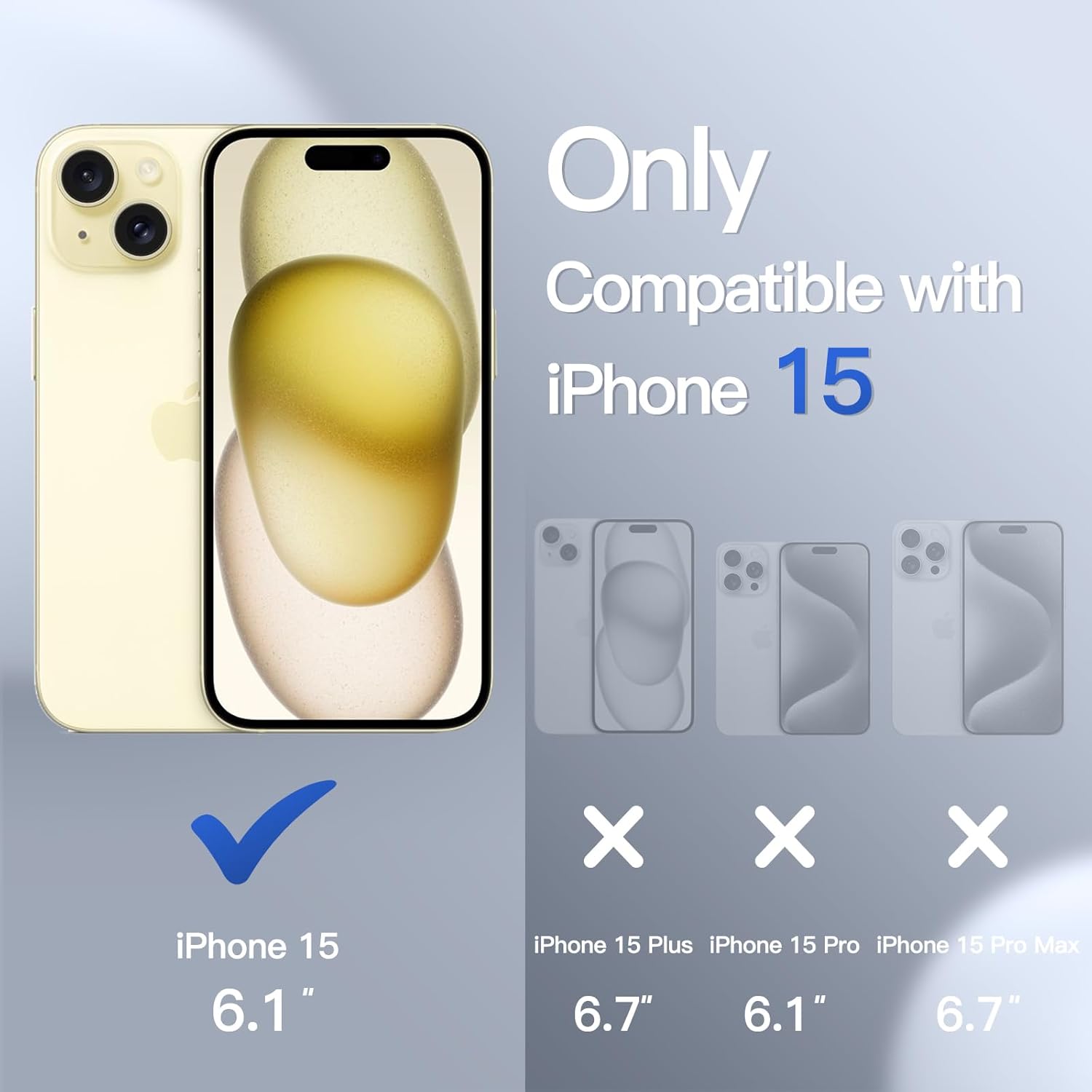• [Тънък профил] Подходящ само за iPhone 15 6.1 инча. Ние се грижим за естетиката и защитата. Този калъф няма да направи телефона ви да изглежда обемист и няма да повлияе на съвместимостта с безжичното зарядно устройство.