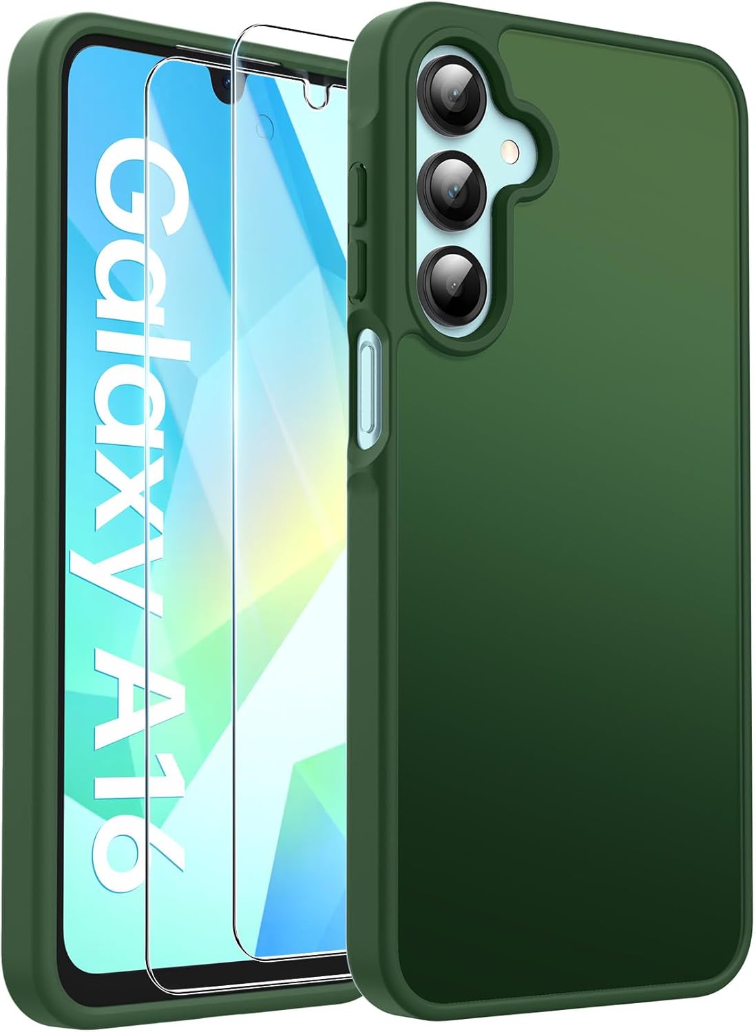 Матов калъф за мобилен телефон FLLAO за Samsung Galaxy A16 5G и 2 протектора за екран, със защита на камерата [Военен стандарт за защита] Прозрачен PC гръб TPU bumper калъф за Samsung A16 - тъмен
