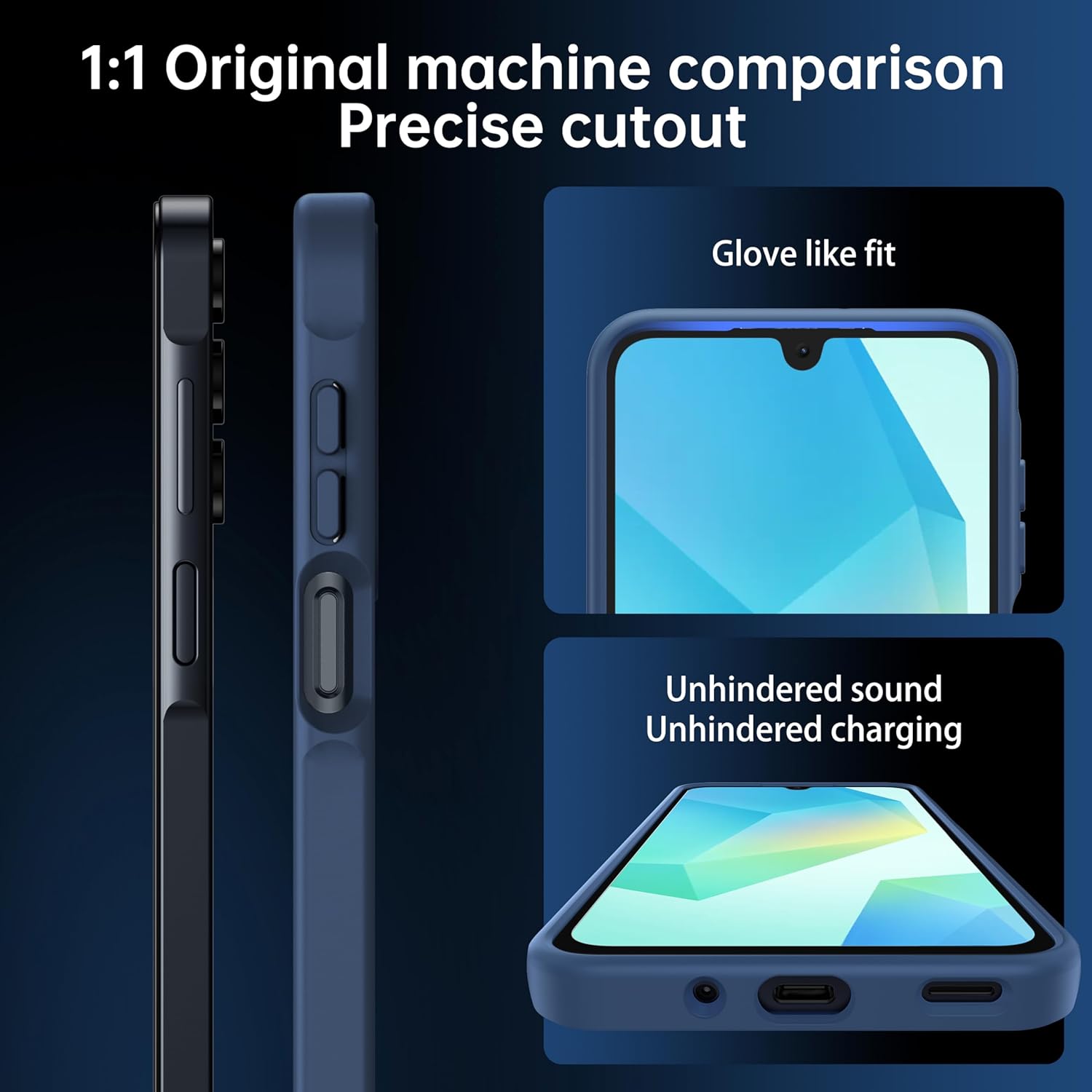 • Перфектно прилягане за защита: матовият защитен калъф на Samsung Galaxy A16 5G е с интегрална форма, с повдигнати с 1,5 мм ръбове на екрана и повдигнат с 1,2 мм ръб на камерата, както и прецизен дизайн на отворите на камерата, което осигурява цялостна защита на мобилния телефон. 100% произведен в съответствие с оригиналните портове за зареждане, аудио портове и бутони на машината, така че можете да ги използвате удобно и да предотвратите попадането на прах и остатъци от вещества в него, които да проникнат и надраскат калъфа на мобилния телефон.