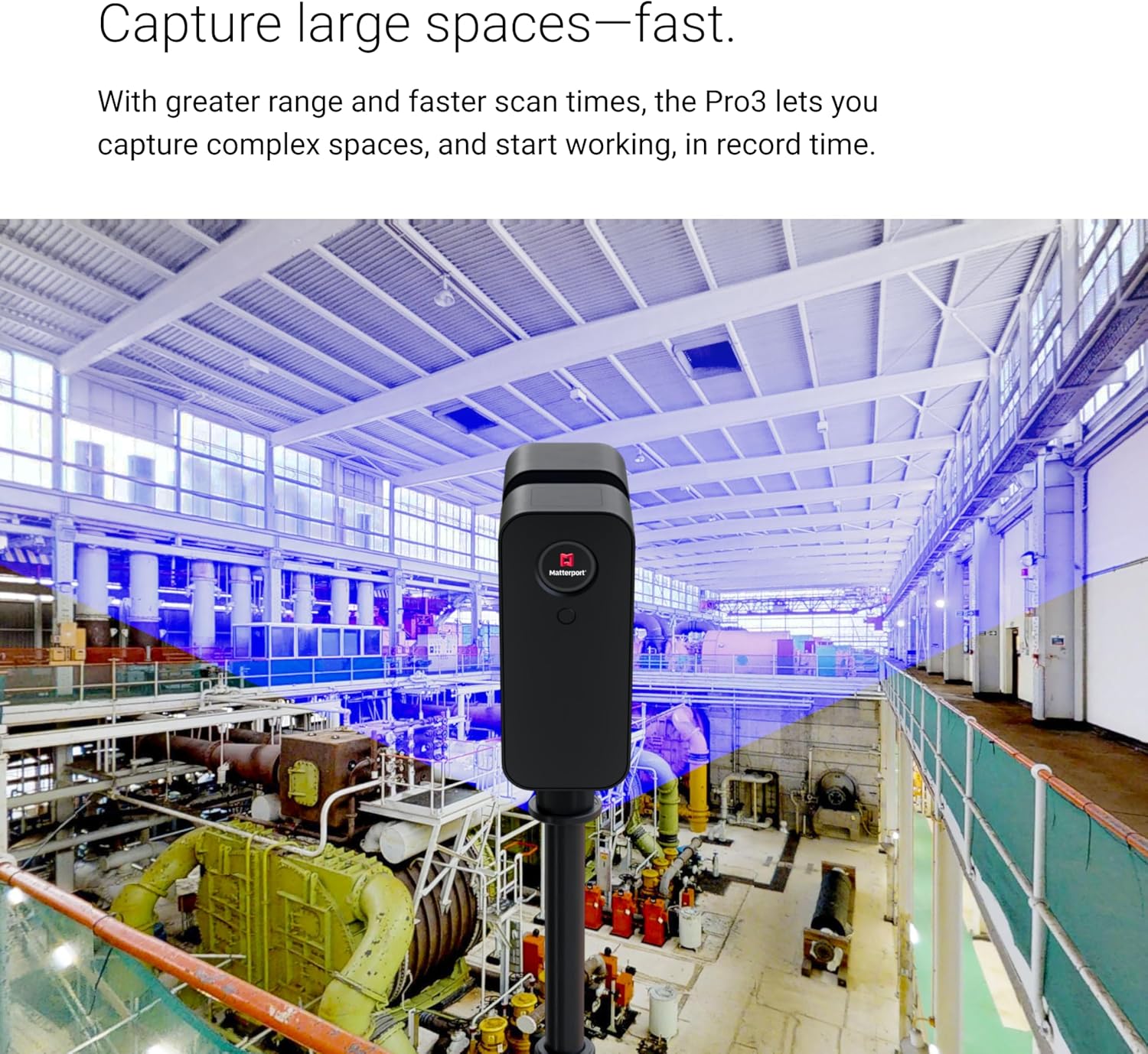 • Завършете всяко сканиране SWEEP за <20 секунди - Мощният сканиращ механизъм на Pro3 означава, че дори големи помещения могат да бъдат заснети бързо и лесно. Независимо дали сканирате на закрито или на открито, под пряка слънчева светлина или при други трудни условия на осветление, Pro3 е винаги готов за предизвикателството.