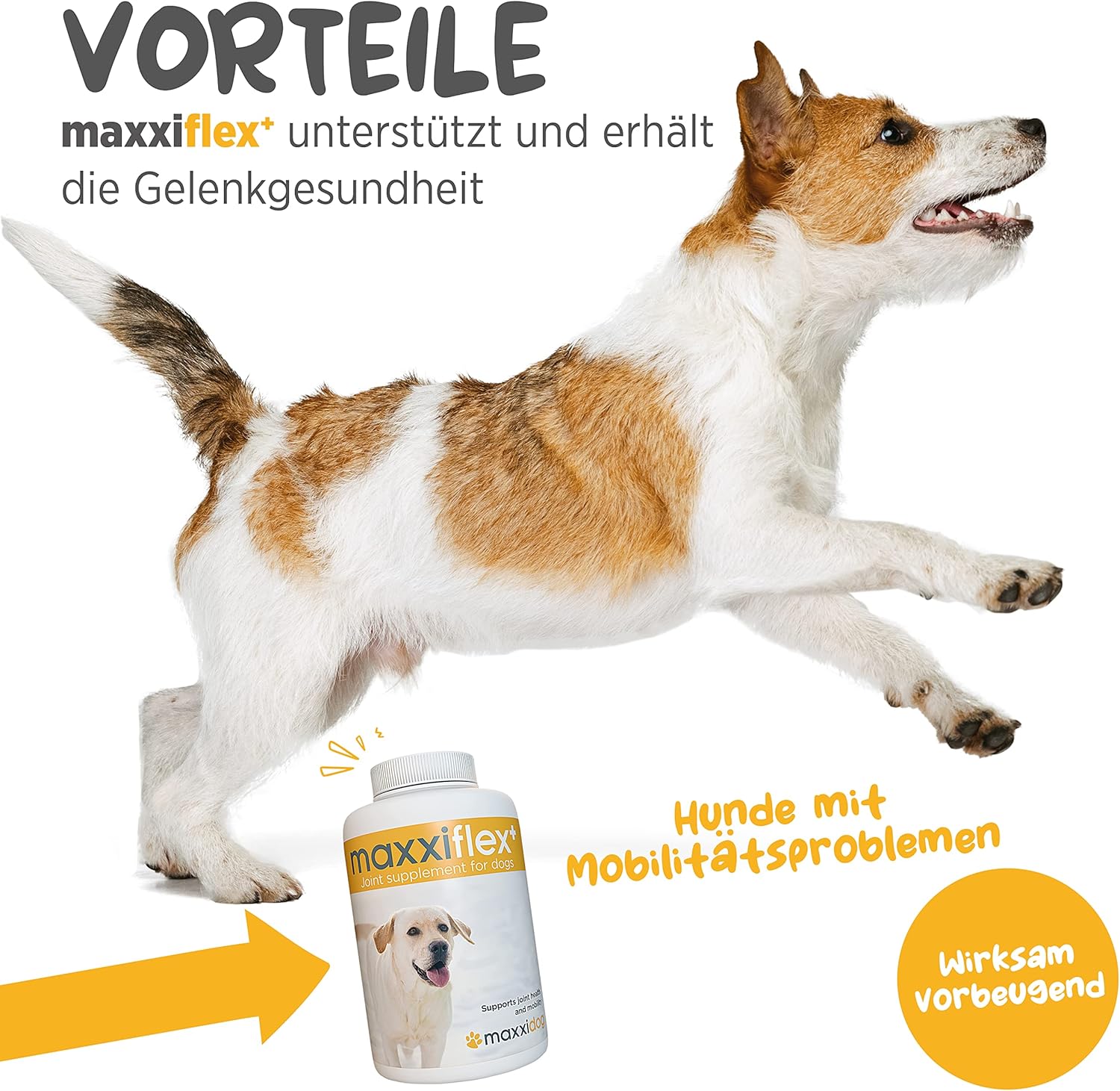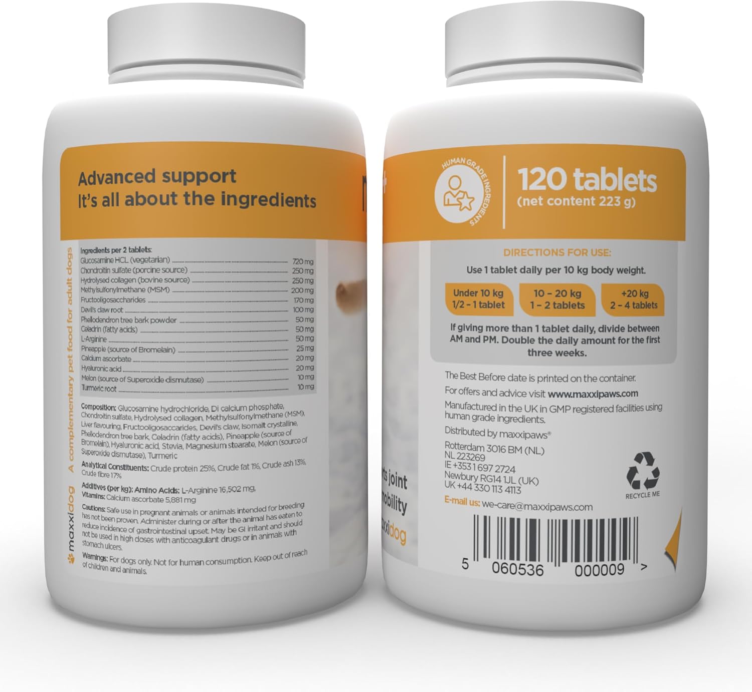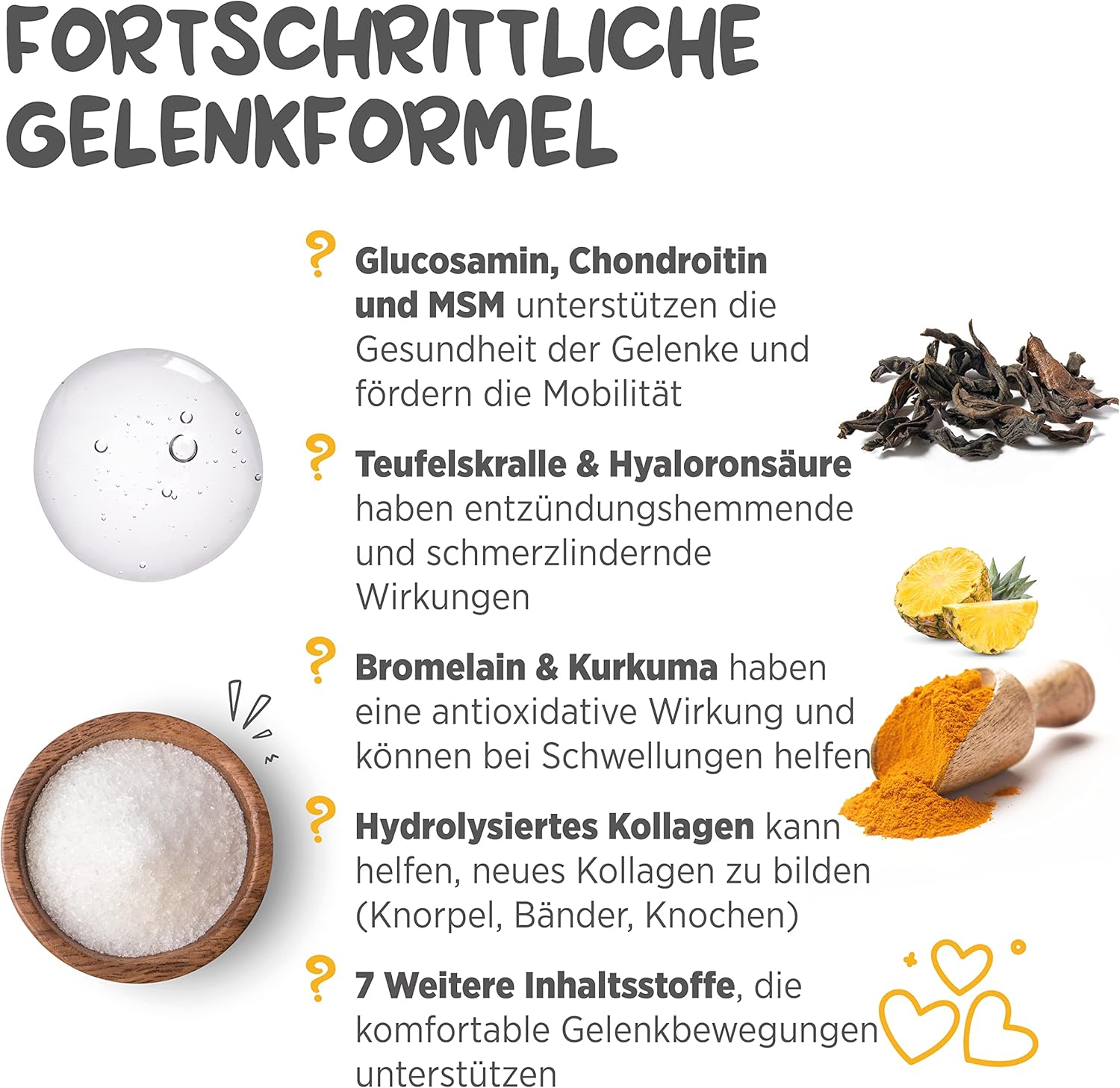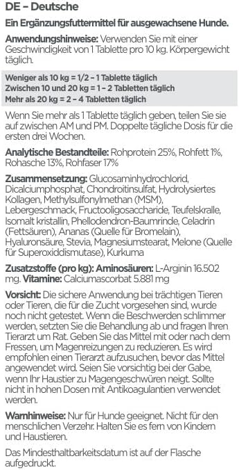 Активни съставки на таблетка: Глюкозамин HCL (растителен) 360 mg, Хондроитин сулфат (говежди източник) 125 mg, Хидролизиран колаген (говежди източник) 125 mg, Метилсулфонилметан (MSM) 100 mg, Фруктоолигозахариди 85 mg, Корен от Дяволски нокът 50 mg, Прах от кора на Фелодендрон 25 mg, Целадрин (мастни киселини) 25 mg, L-аргинин 25 mg, Ананас (източник на бромелаин) 12.5 mg, Калциев аскорбат 10 mg, Хиалуронова киселина 10 mg, Пъпеш (източник на супероксид дисмутаза) 5 mg, Корен от куркума 5 mg. Неактивни съставки: Дикалциев фосфат, екстракт от малц, магнезиев стеарат, подобрител на вкуса, стевия. Без глутен.