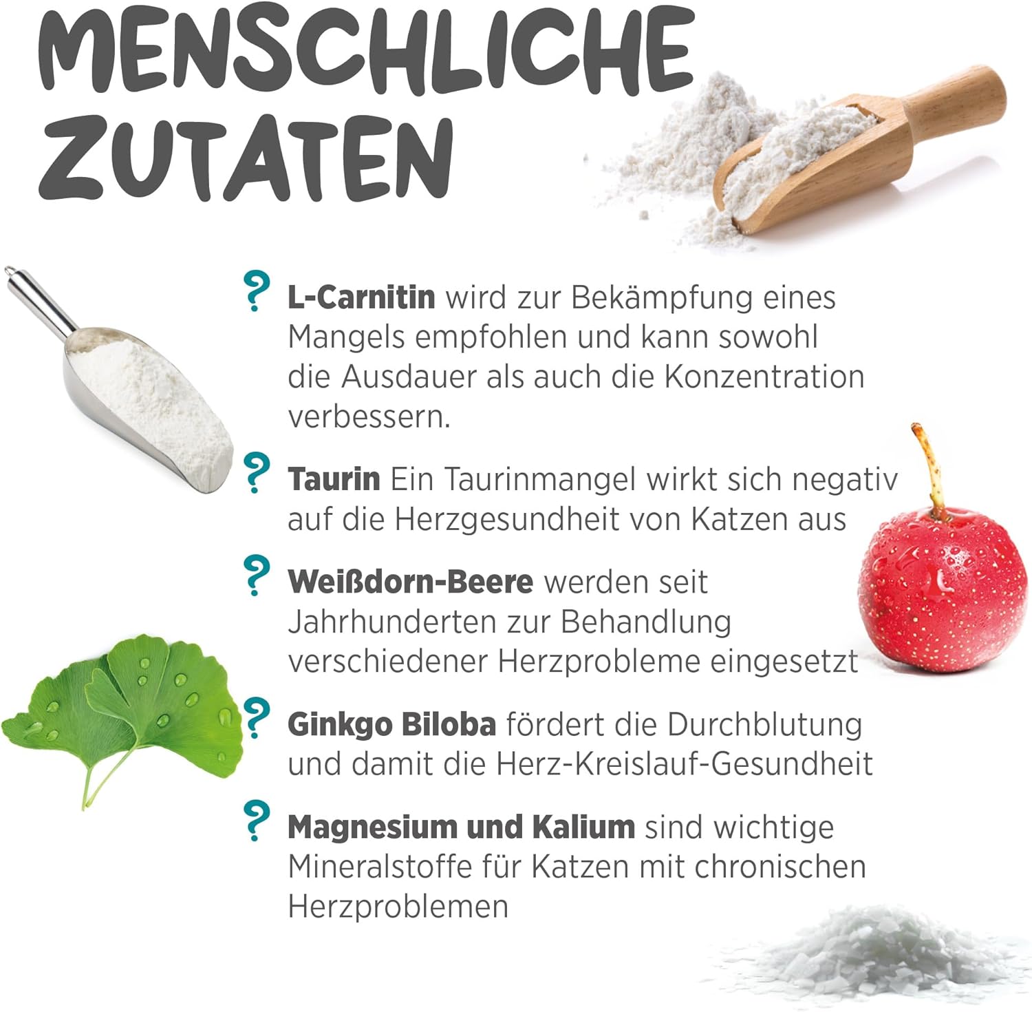 • НАТУРАЛНИ СЪСТАВКИ: L-карнитинът може да помогне за поддържане на издръжливостта и концентрацията; дефицитът на таурин може да повлияе на здравето на сърцето на вашия домашен любимец; глогът се препоръчва при сърдечни проблеми; гинко билоба може да подпомогне кръвообращението; магнезият и калият са полезни минерали за котки със сърдечни проблеми.