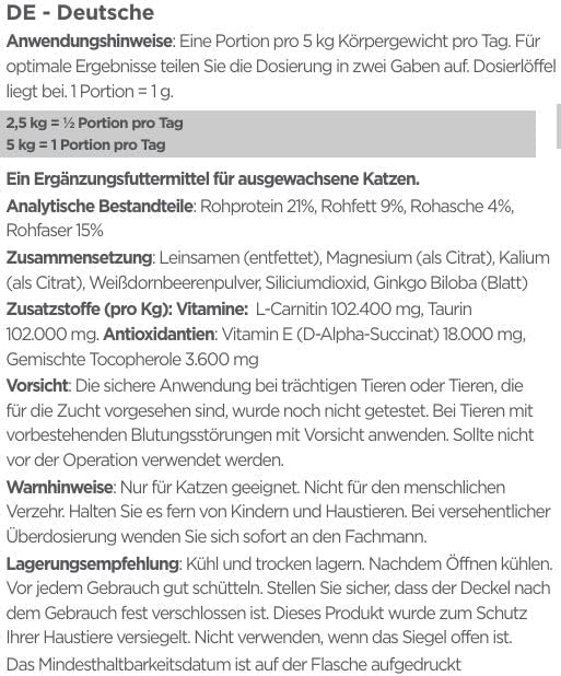 • ВКУСНА ПРАХООБРАЗНА ФОРМУЛА: maxxicardio е прахообразна допълнителна храна с естествен аромат, която лесно се смесва с храната и се абсорбира бързо. Добавяйте 1 лъжичка на 5 кг телесно тегло дневно. Подходяща за малки, средни и големи котки.