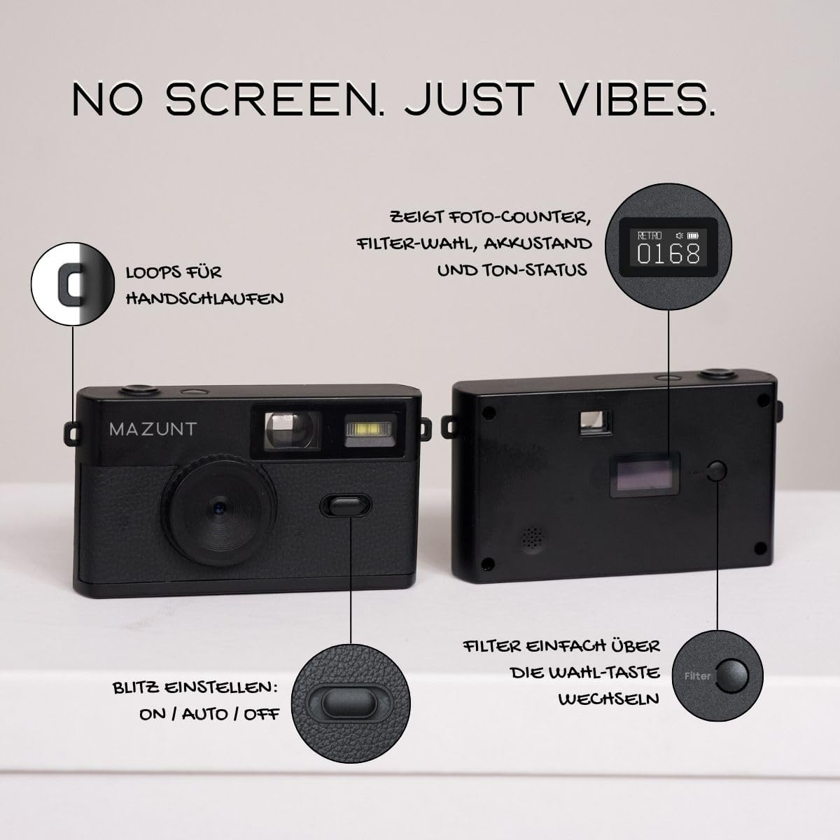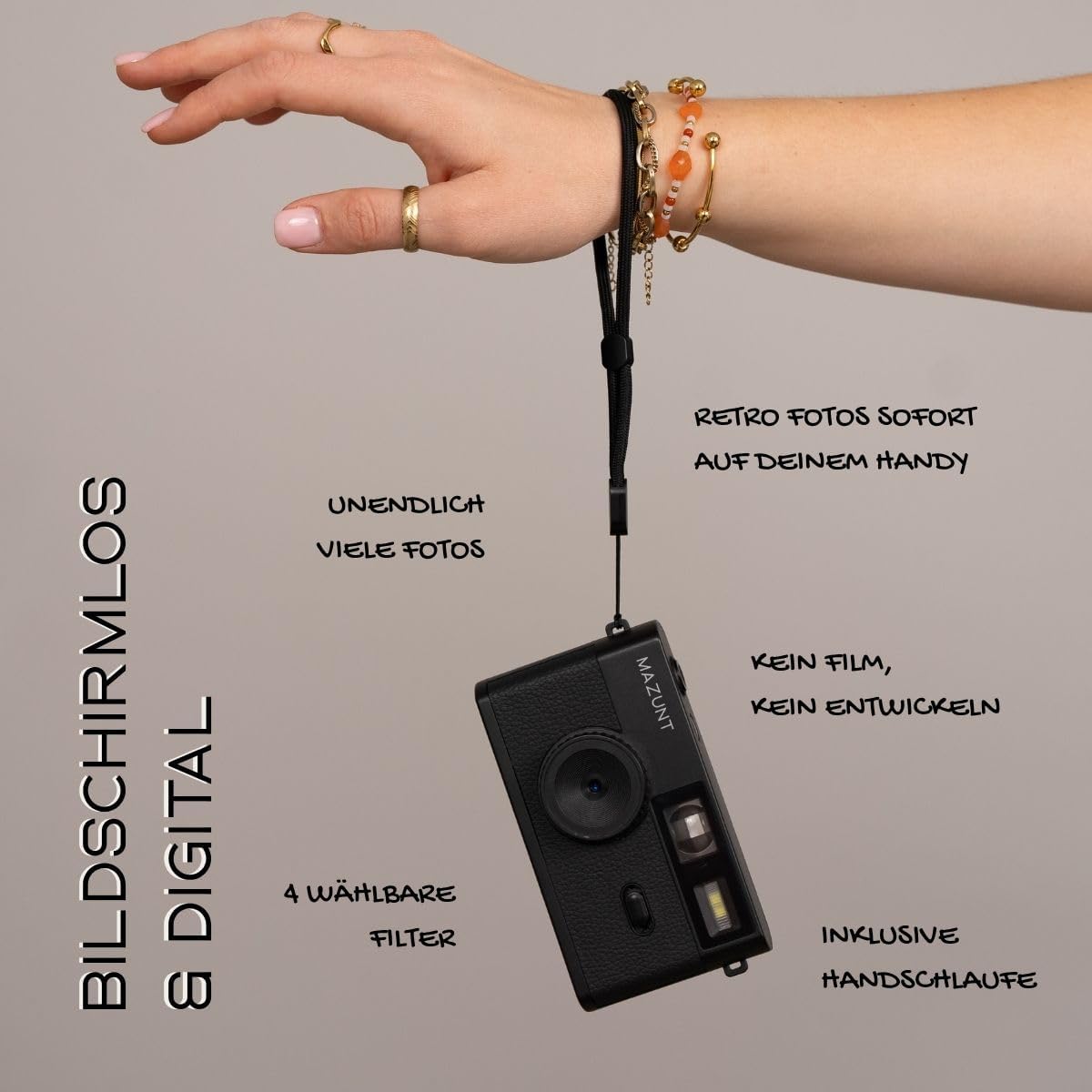 • Хиляди снимки: MAZUNT ви предлага устойчив заместител на фотоапаратите за еднократна употреба и филмовите фотоапарати. Снимките се съхраняват дигитално на вградената 8 GB SD карта и лесно се прехвърлят към мобилен телефон или лаптоп чрез USB-C кабел.