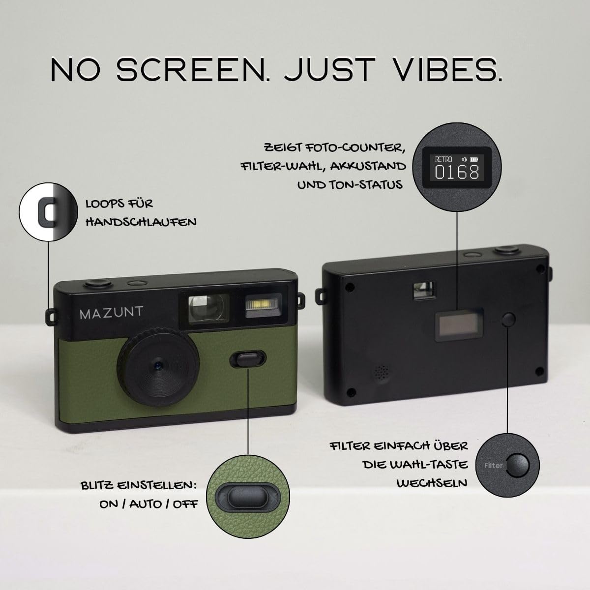 • РЕТРО ЧУВСТВО: Изживейте истински моменти без никакъв дисплей или разсейване. MAZUNT съчетава аналогова естетика с дигитална технология - без филм, без проявяване, без допълнителни разходи, без време за чакане