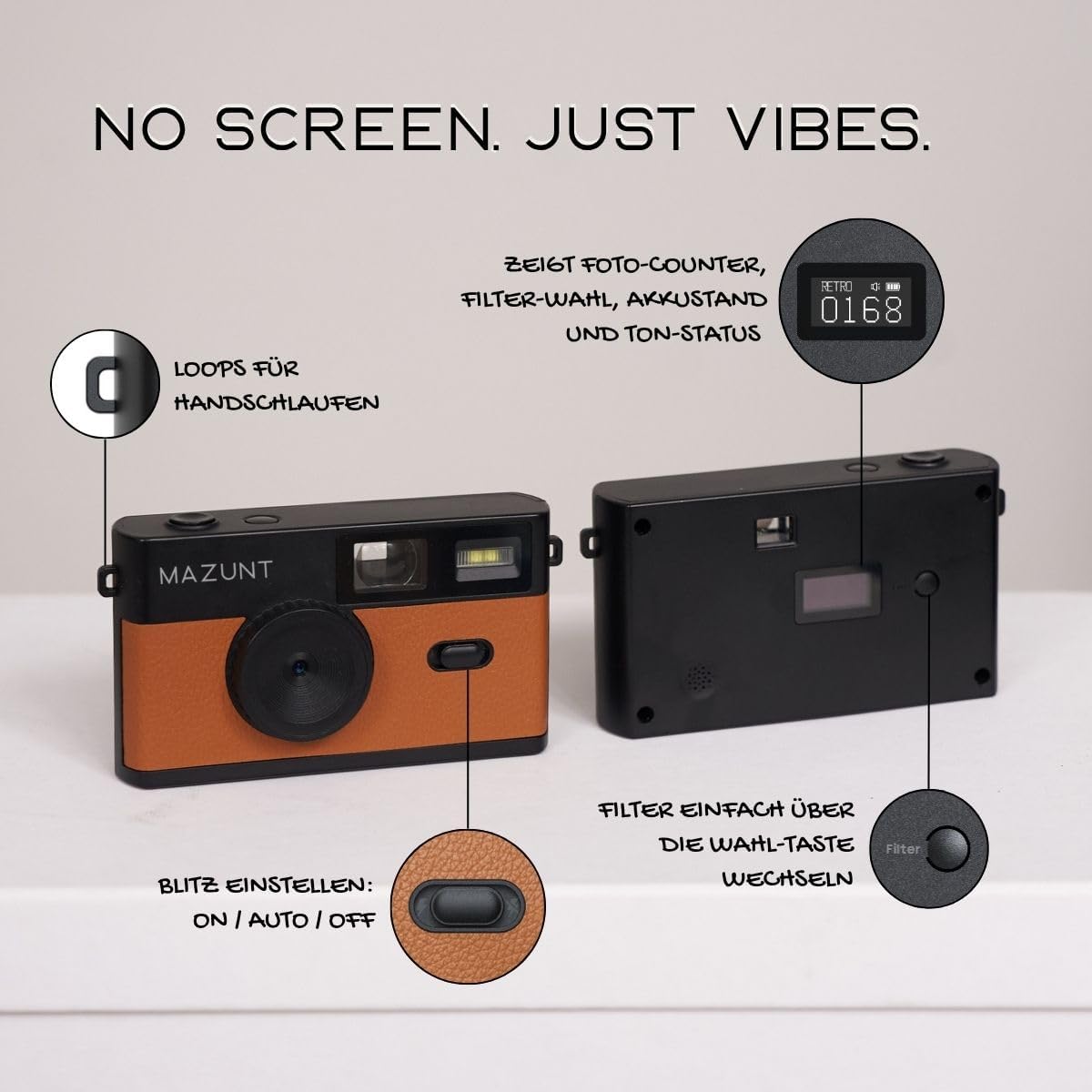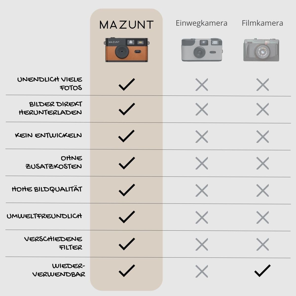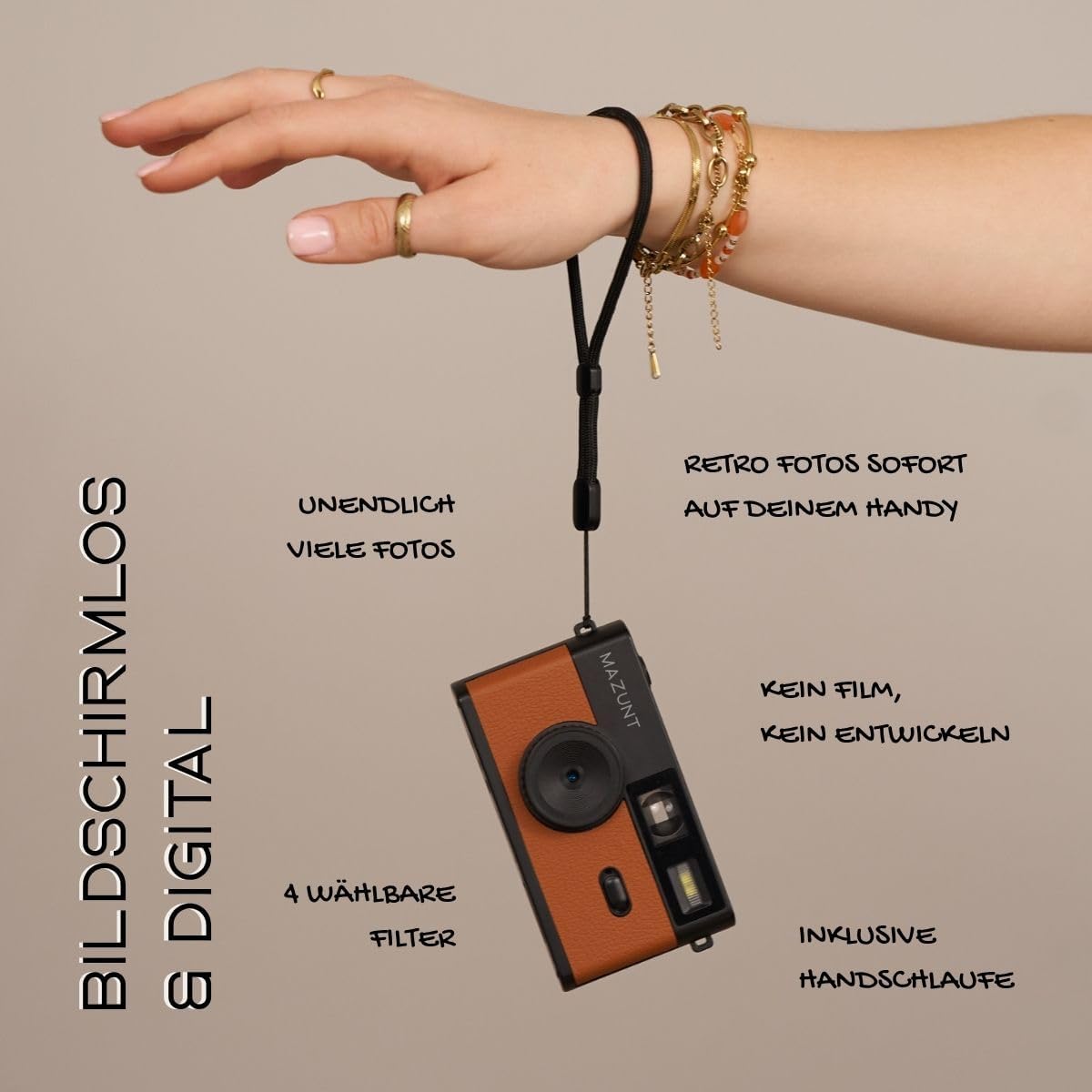 • Хиляди снимки: MAZUNT ви предлага устойчив заместител на фотоапаратите за еднократна употреба и филмовите фотоапарати. Снимките се съхраняват дигитално на вградената 8 GB SD карта и лесно се прехвърлят към мобилен телефон или лаптоп чрез USB-C кабел.