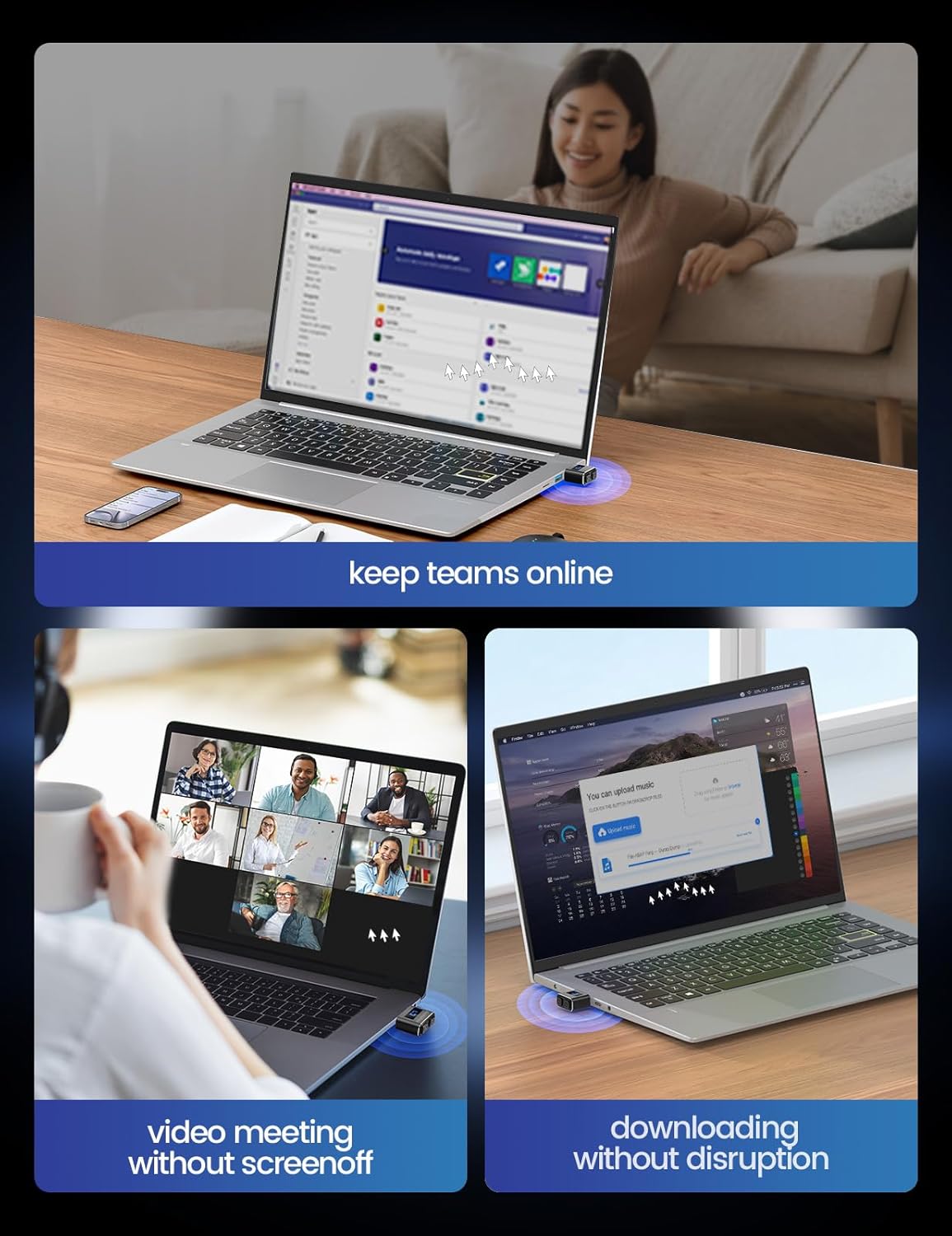 • Широко приложение: тази мишка се използва в много приложения, като онлайн срещи, онлайн игри, онлайн четене, отдалечена връзка и др. Тя поддържа компютъра активен, както и вашите Microsoft Teams, Skype, Webex, Lync и др. Съвместима е с повечето операционни системи на пазара, Windows XP/7/8/10/11, Mac OS, Android система и др.