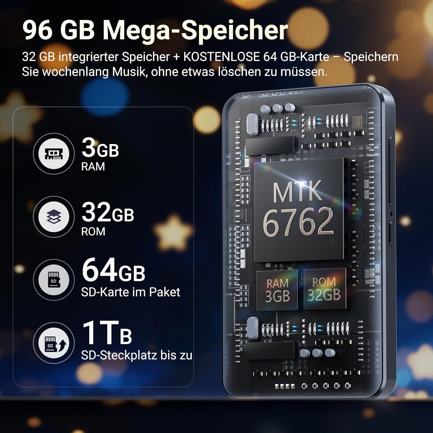 • Място за 45 000+ песни - Двойна памет: С 32 GB вътрешна памет + 128 GB безплатна SD карта (общо 160 GB), можете да съхранявате над 45 000 песни (на база 3 MB на песен) или 800+ HD видеоклипа. Разширяемо до 1 TB - достатъчно място за цялата ви медийна колекция!