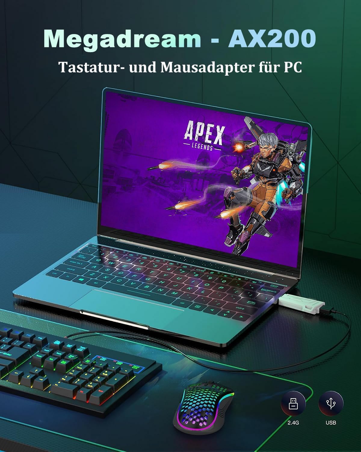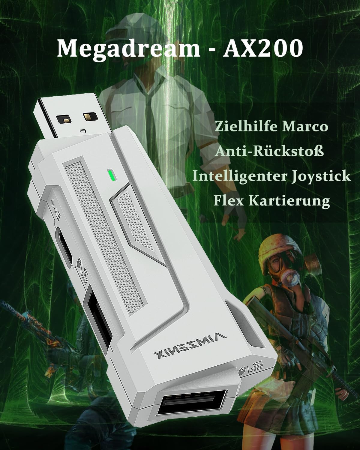 Megadream AX200 PC геймърски адаптер за клавиатура и мишка, настройка от приложение с функция за интелигентен джойстик, честота на отчитане 1000Hz, без зареждане, гъвкаво картографиране, конвертор за геймърска клавиатура и мишка за конзола