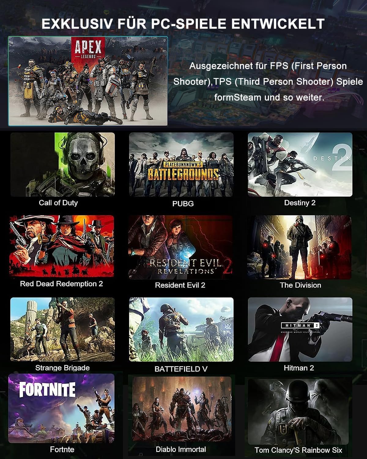 • Не се ограничава до: Apex Legends, COD: Modern Warfare, Destiny2, PUBG. Ако не можете да намерите PC игра в списъка с игри на приложението "GEEKVICE", това не означава, че не можете да играете, а че можете сами да играете играта и да я персонализирате според типа FPS игра, която искате да играете.