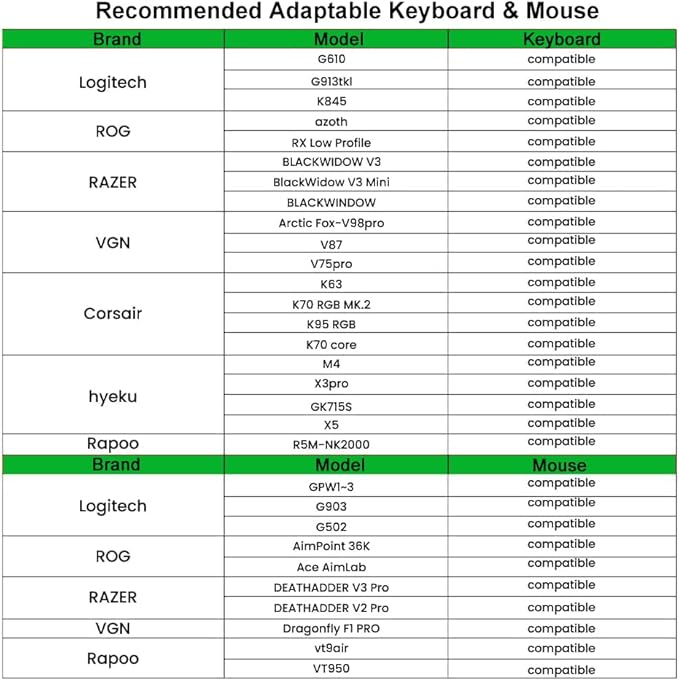 • Последна версия: За да осигурите най-доброто игрово изживяване, моля, актуализирайте приложението GEEKVICE [1.4.8] и фърмуера на AX200 [2610] до най-новата версия. Широка поддръжка: Конверторите за клавиатура и мишка Megadream AX200 са широко съвместими с кабелни клавиатури, кабелни мишки, клавиатури с пълен размер, клавиатури за една ръка и 2.4G безжична клавиатура/мишка; не е за Bluetooth клавиатура и мишка.