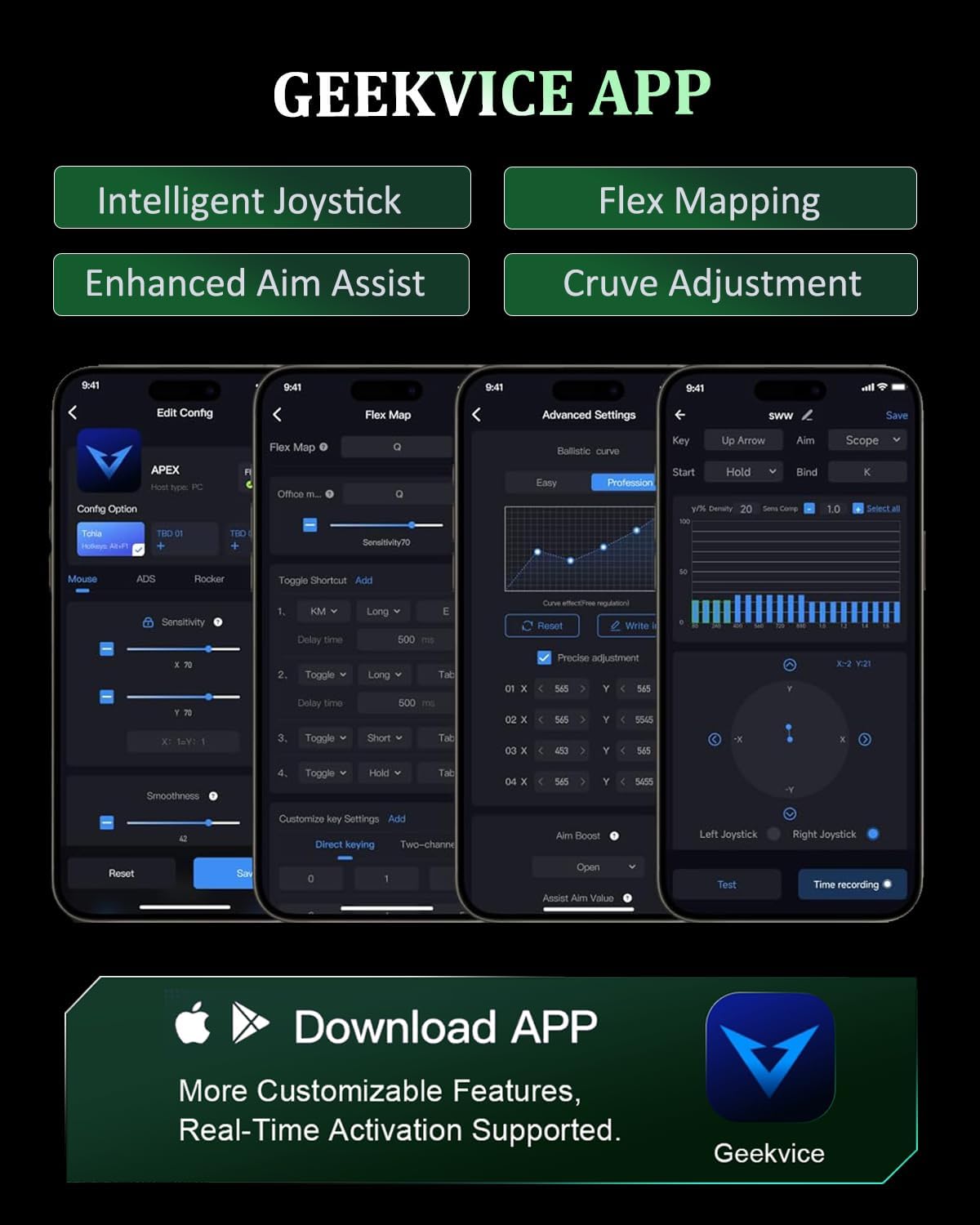 • Креативен дизайн: конверторът за компютърна клавиатура и мишка преобразува входните данни от клавиатурата и мишката в сигнали от контролера; Поддържа персонализиране чрез приложението "Geekvice", можете да разглеждате множество предварително направени конфигурации за различни игри и да регулирате параметри като чувствителност и настройки, което ви дава предимство в различни игрови сценарии; Лесно ги персонализирайте от вашия смартфон, без да излизате от играта и без да зареждате устройството, както и без да се налага да зареждате устройството.