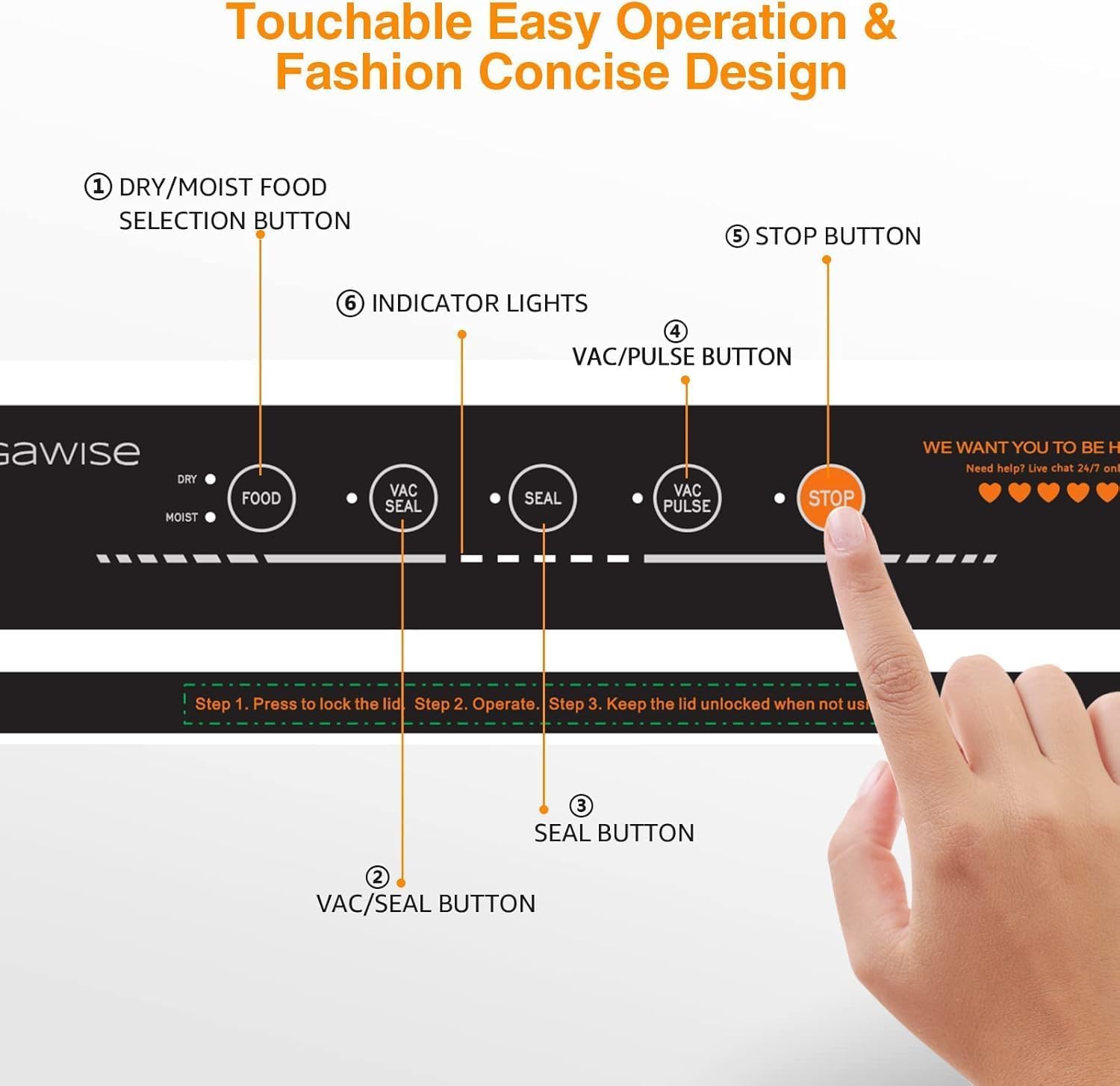 • РАБОТА С ЕДНО ДОКОСВАНЕ И ДВА СПЕЦИАЛНИ РЕЖИМА Толкова просто, бързо и удобно: с едно докосване на бутона за вакуумиране/запечатване можете да вакуумирате храната за 10-20 секунди. 12-инчовата запечатваща тел поддържа запечатване на 3-5 плика едновременно. Изберете сух или мокър режим според вида на храната; сухият режим е за твърди продукти, а мокрият режим за поширани, варени или задушени храни и осигурява на вашата храна най-внимателната защита.