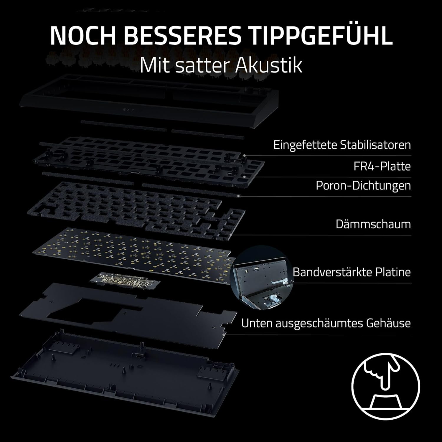 • Меко подплатена магнитна поставка за китката, изработена от синтетична кожа. За още по-голям комфорт при игра: Благодарение на меко подплатената поставка за китката, която се закрепва здраво към клавиатурата, можете да се наслаждавате на часове комфорт дори по време на най-интензивните гейминг маратони.