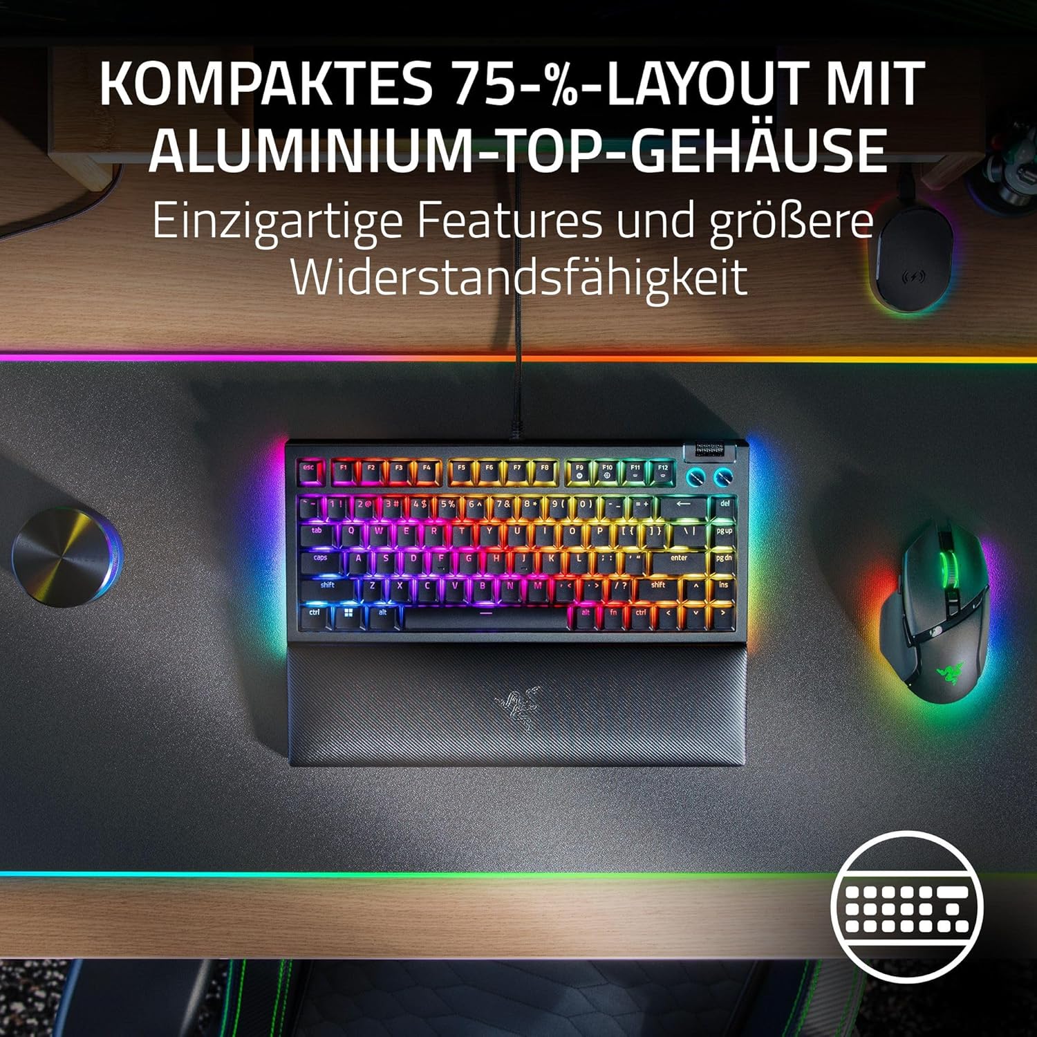 Механична геймърска клавиатура Razer BlackWidow V4 75% с възможност за гореща замяна (компактно разположение 75%, осветление на долната част от 2 страни, многофункционални контроли и медийни бутони) ISO US оформление, черна