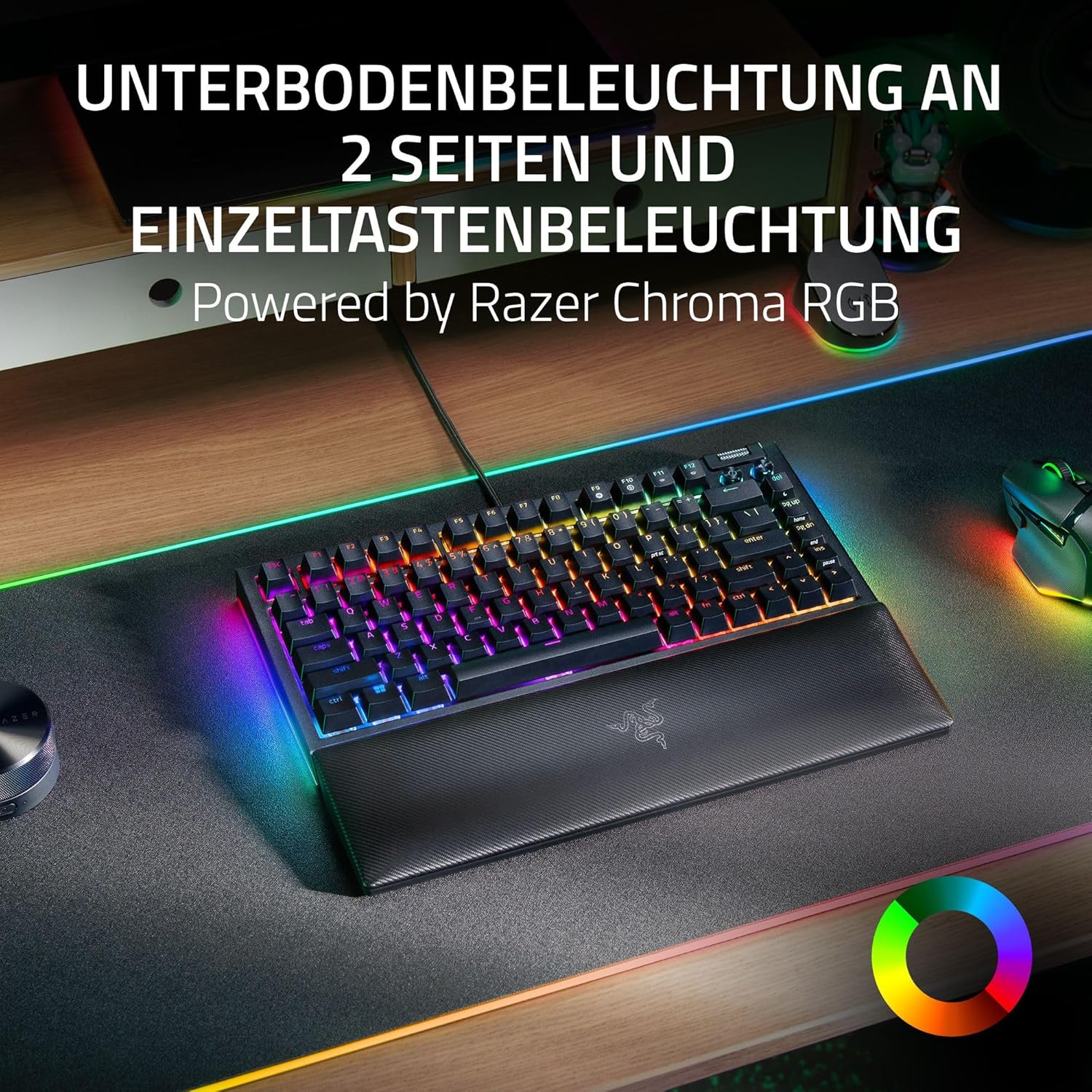 • Двустранно осветление на долната част и осветление на всеки клавиш, задвижвано от Razer Chroma RGB: Осветлението на всеки клавиш и хипнотизиращото осветление на долната част осветяват клавиатурата от още повече ъгли, перфектно синхронизирани с вашата Battle Station за още по-голямо потапяне в стотици поддържани игри.