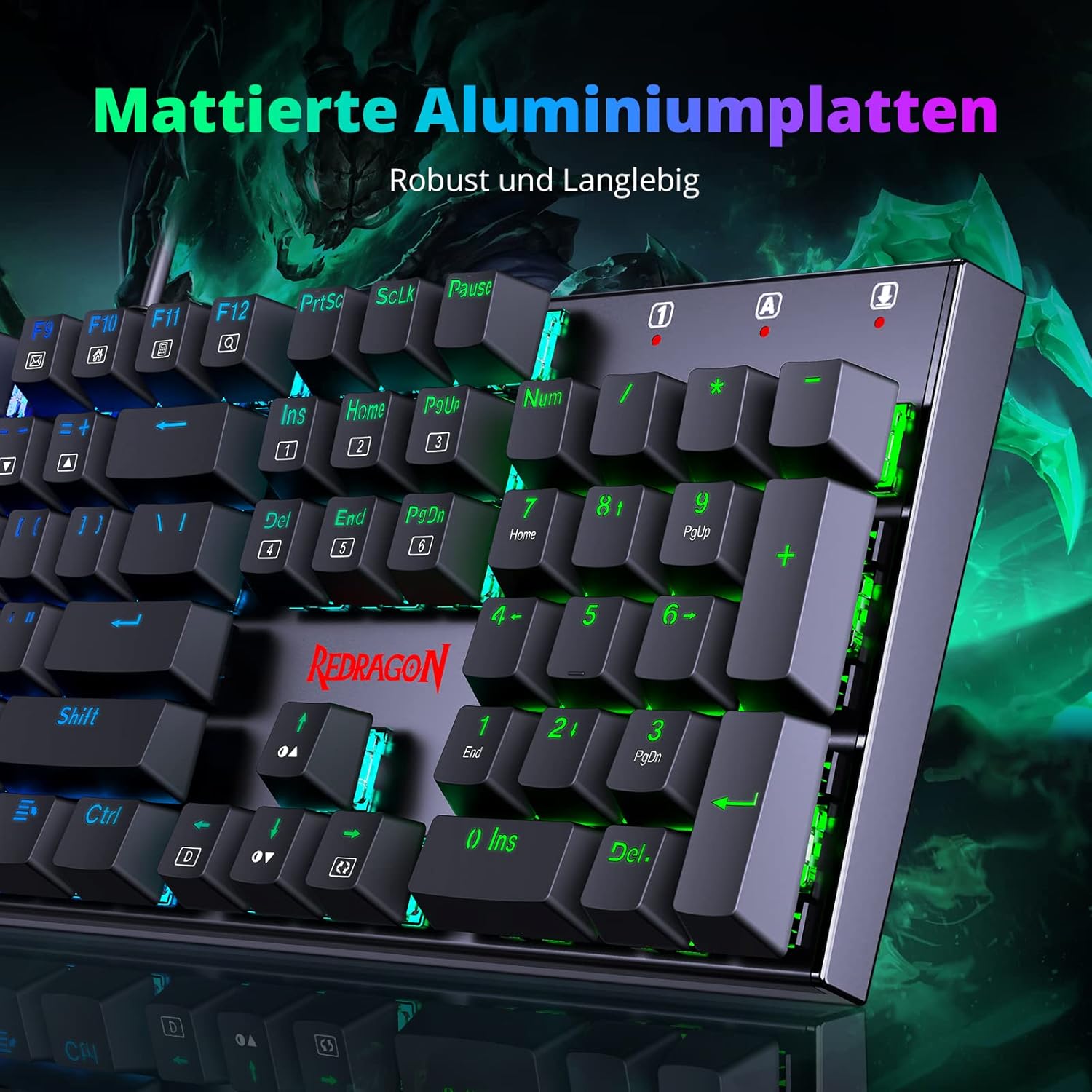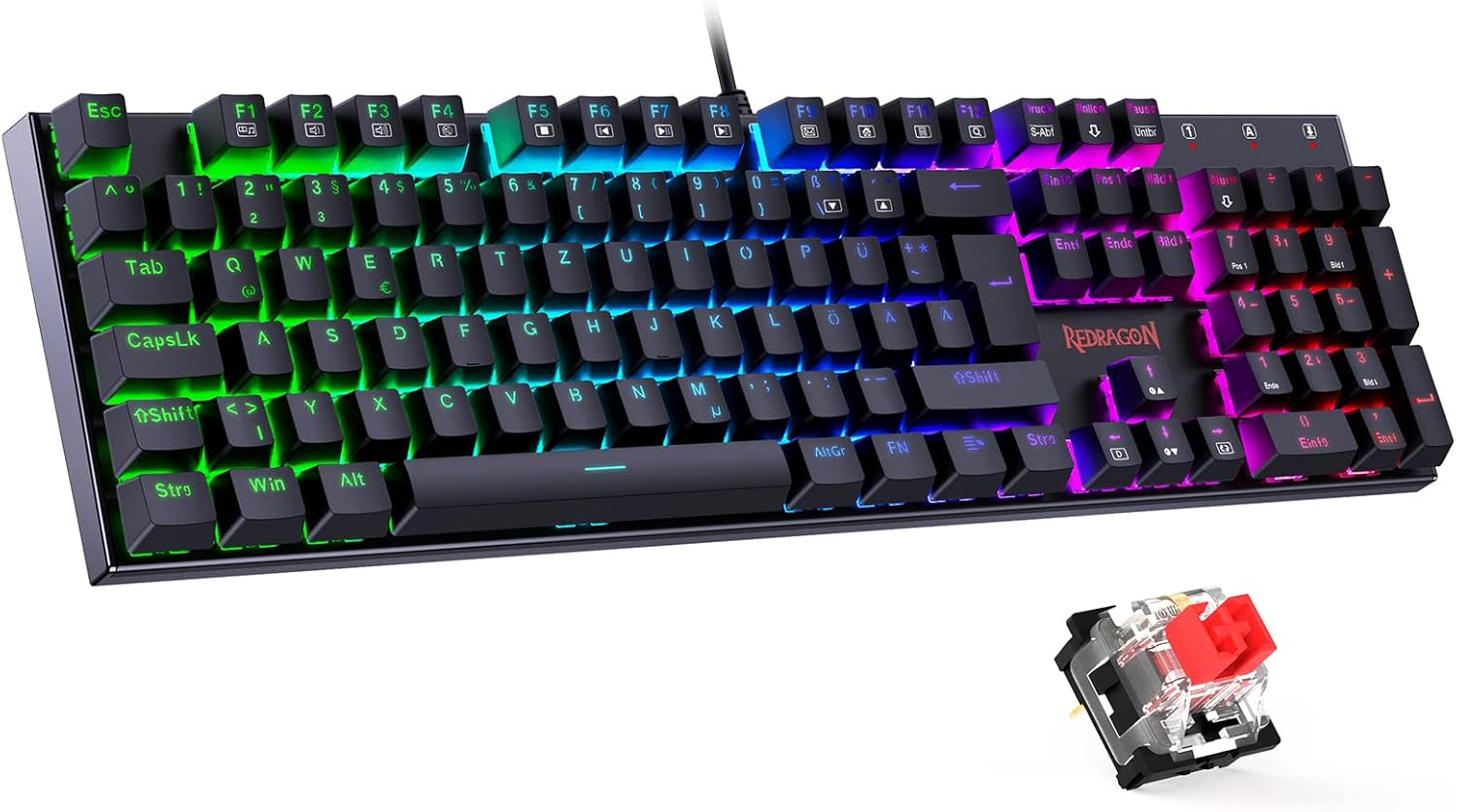 Механична геймърска клавиатура Redragon, QWERTZ клавиатура (немска подредба) с червен превключвател за работа с PC геймъри, 105 програмируеми кабелни клавиша, стоманен корпус, RGB осветление