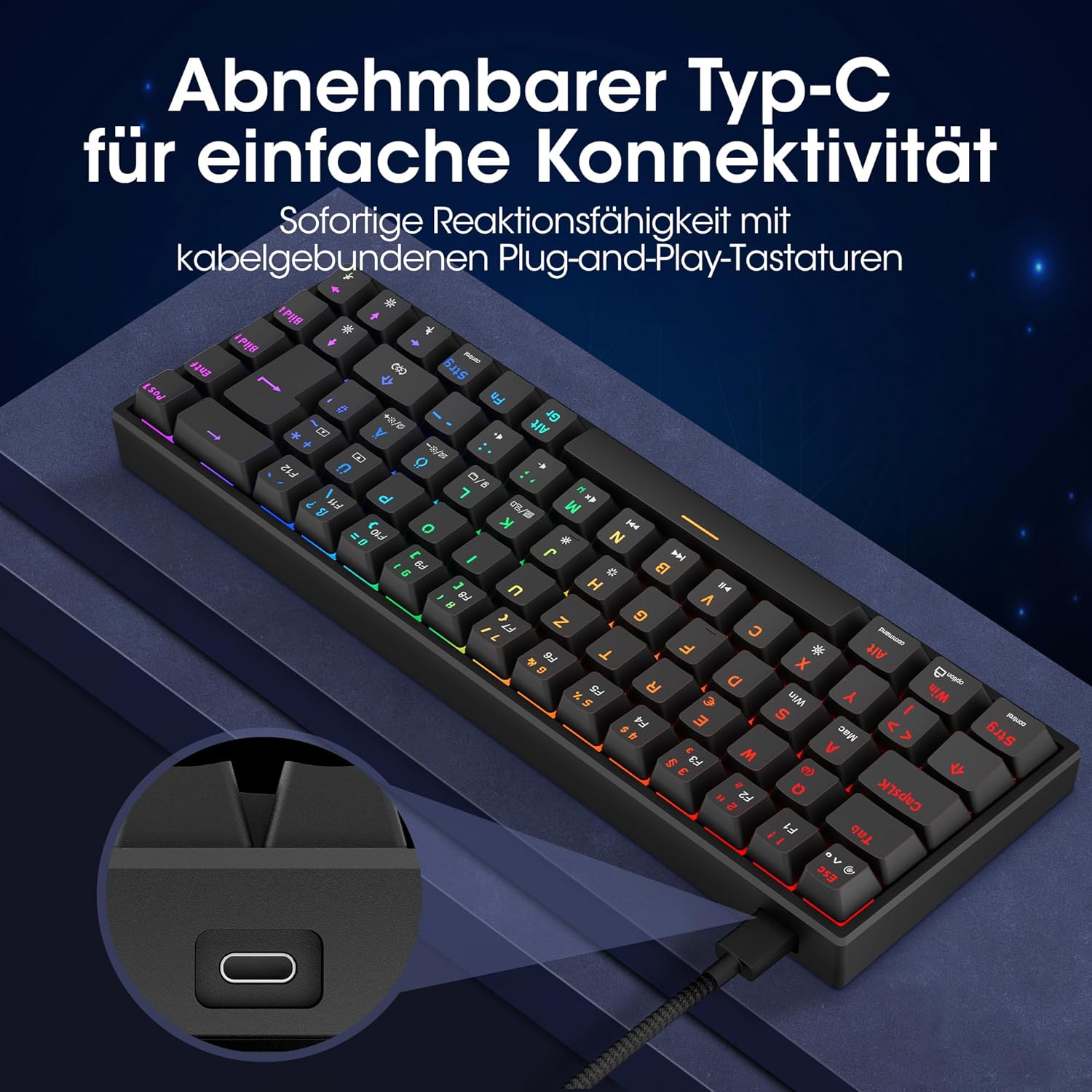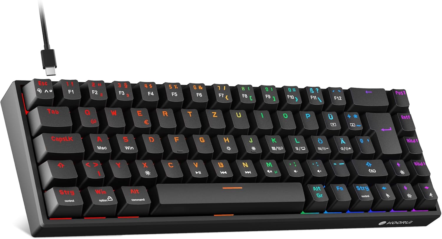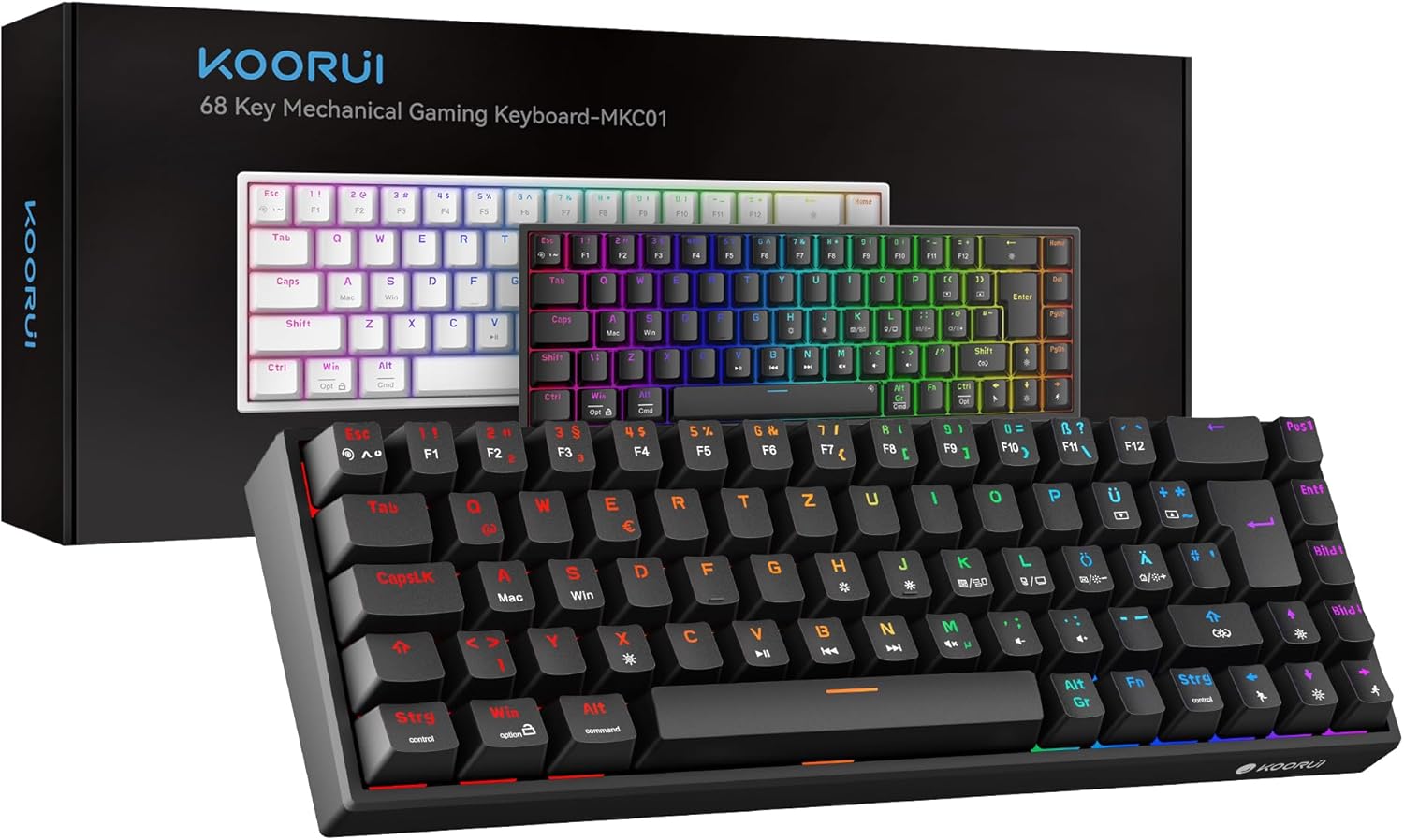 Механична клавиатура KOORUI, 60% геймърска клавиатура с 12 клавиша, многофункционален бутон, USB кабел, пълно превключване на клавишите, немска подредба, QWERTZ за Windows, MacOS, Linux, червен превключвател, черна