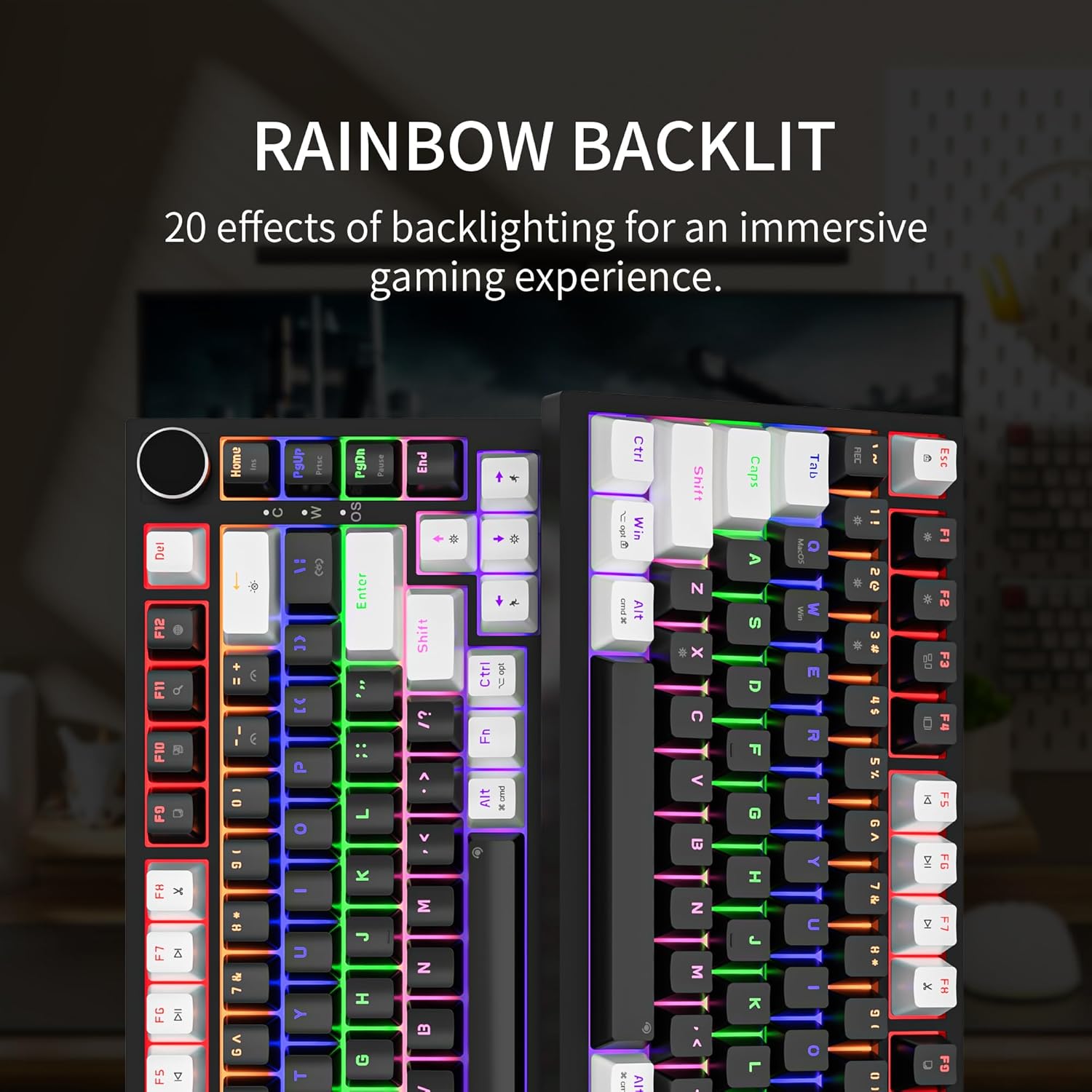 Малката кабелна клавиатура предлага 20 вида подсветка с цветовете на дъгата. С бутоните Fn+X можете да включвате и изключвате осветлението, да превключвате режимите на подсветката с бутоните Fn+↑↓, за да регулирате яркостта на подсветката, с бутоните Fn+-_=+ да регулирате скоростта на подсветката и да регулирате посоката на светлинните ефекти с бутоните Fn+↑↓.