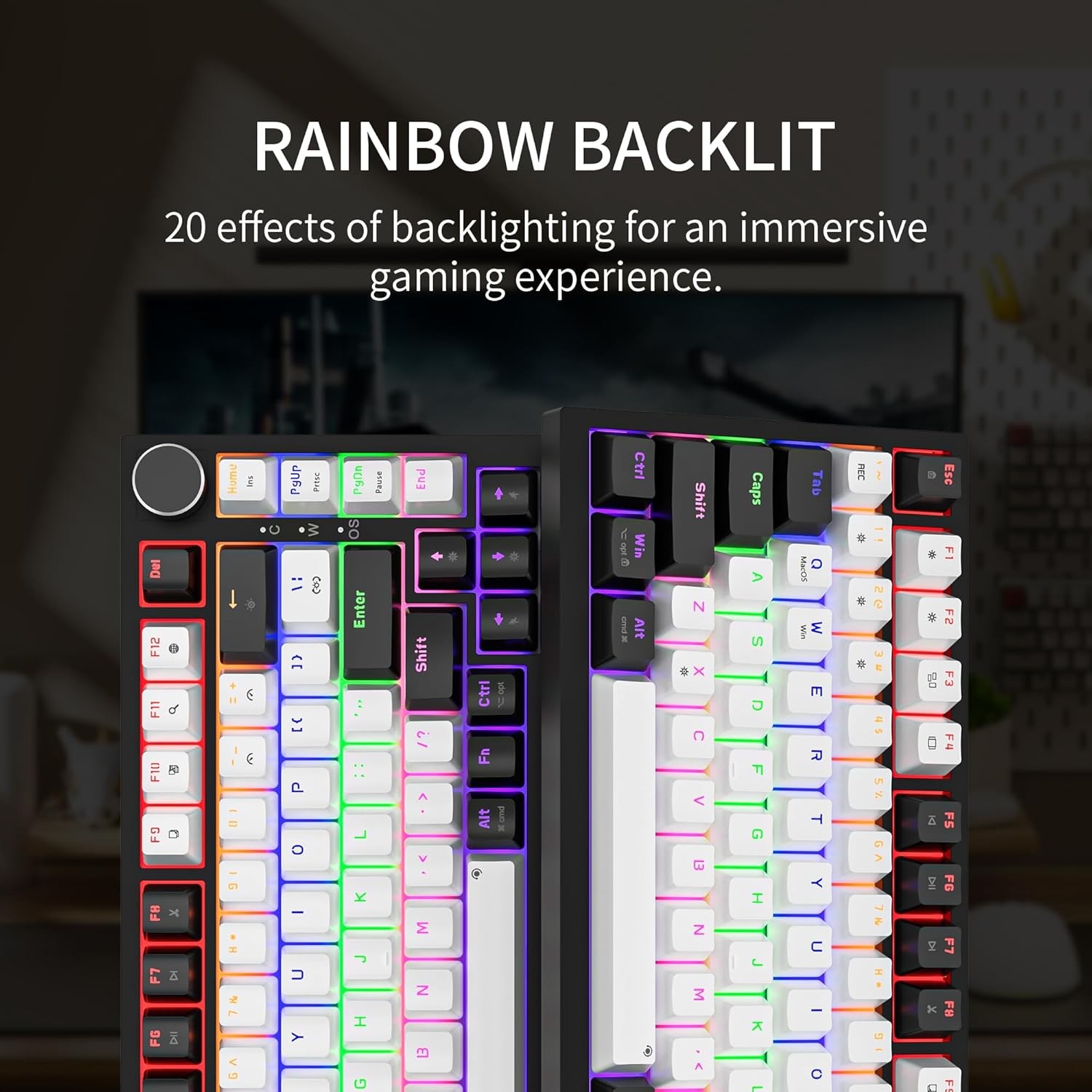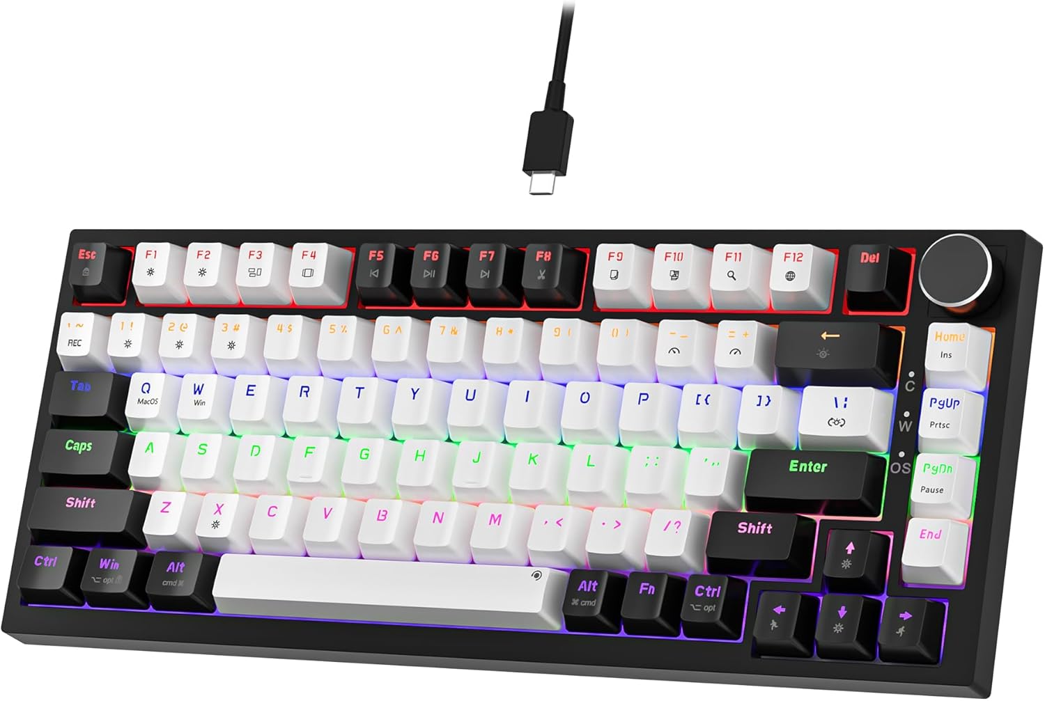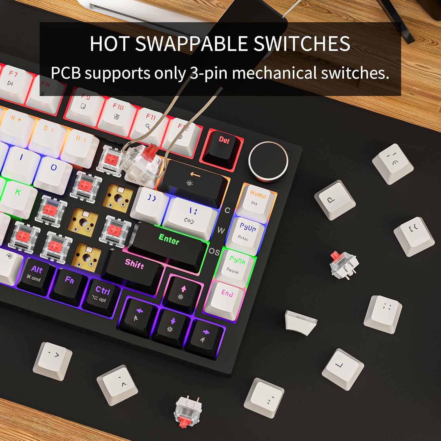 Механична клавиатура Newmen GM326 с кабел, геймърска клавиатура 75 процента, TKL Hot Swap LED осветление, USB C мини механични клавиатури с бутони, за PC/Win/Mac, QWERTY оформление, черно/бяло, червено