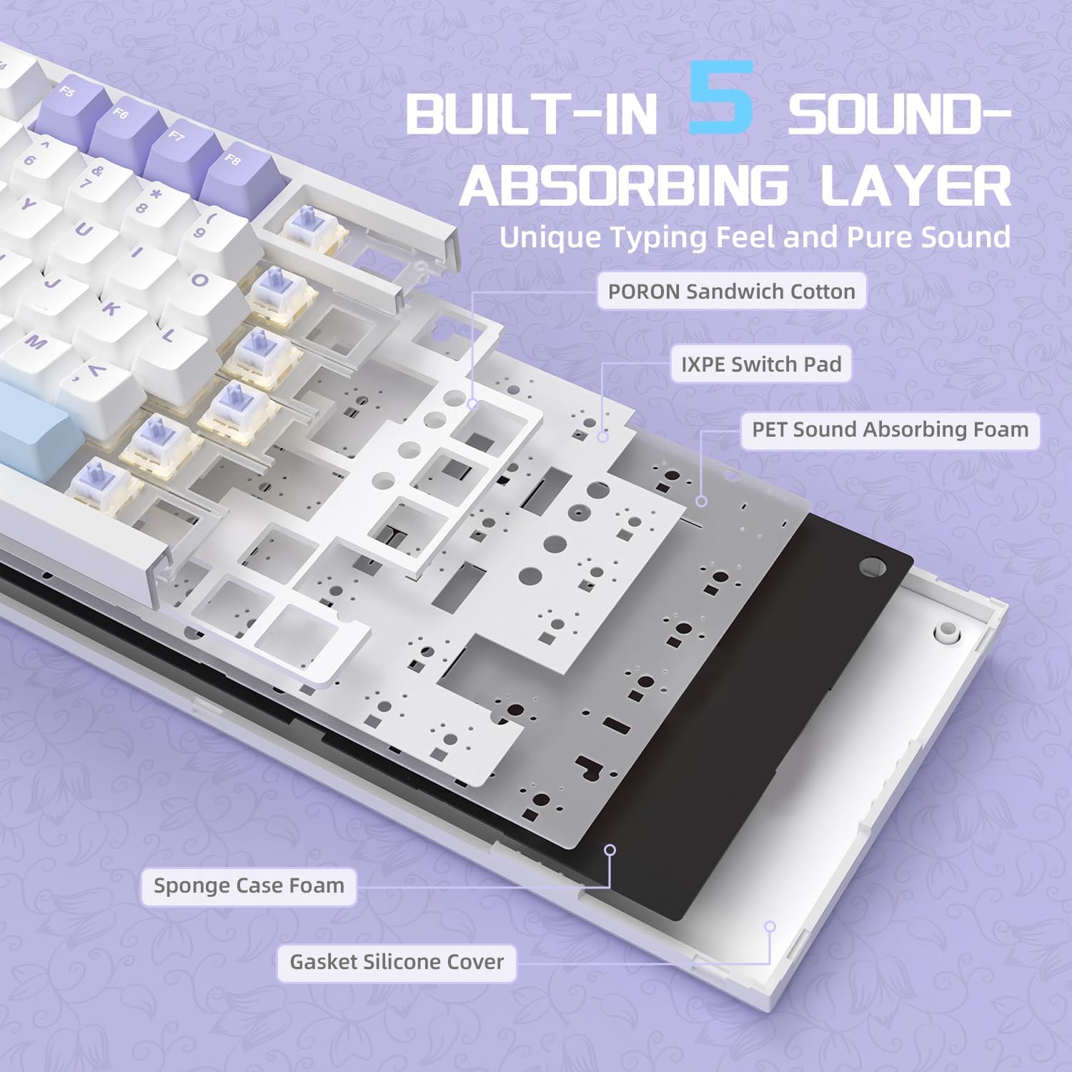 • Подобрена механична клавиатура с уплътнителен монтаж: подобрението. Вградени са 5 слоя звукопоглъщащ памук между горната част, превключвателя, платката и долната част, включително: PORON сандвич памук, 8×IXPE подложка за превключватели, звукопоглъщаща PET пяна, пяна за корпуса от пяна, силиконова подложка отдолу. Шумът е намален до максимум и осигурява изключително мек, чист звук и плавно писане.