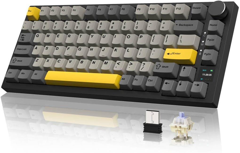 • 【75% ANSI оформление и дизайн на бутоните】Възползва се най-популярното 75% AINSI оформление с 81 клавиша, което го прави практичен избор за работа/игри. Лесно управление с вградения CNC алуминиев контрол на силата на звука. Завъртете го наляво/надясно, за да промените силата на звука, натиснете бутона, за да включите/изключите светлината. Също така регулирайте бутона поотделно.