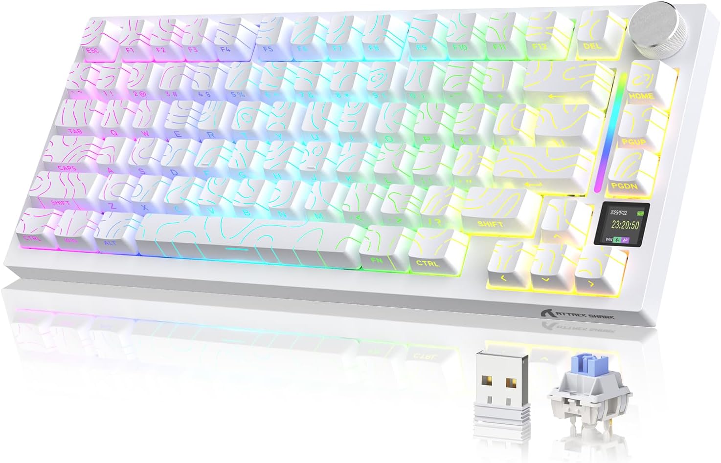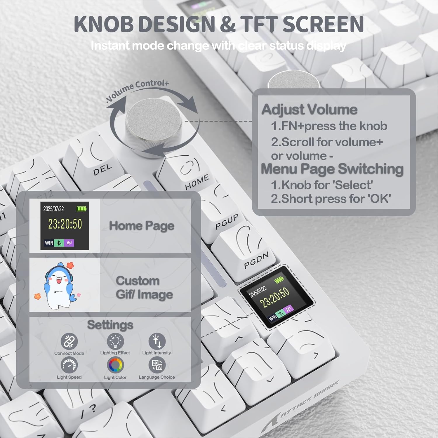 Механична клавиатура YINDIAO ATTACK SHARK X820 Ultra Gasket с TFT дисплей и бутони, 75% ANSI оформление, 2.4GHz/BT/Кабелна, 5 звукопоглъщащи пяни, с възможност за гореща смяна, за PC, MAC (бяла, Shark Switch)