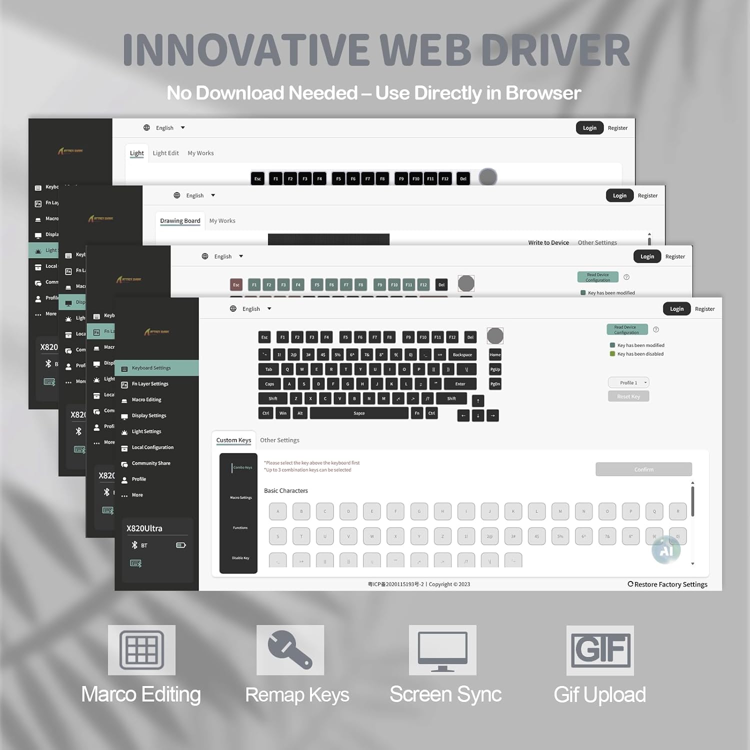 • Подобрена механична клавиатура с уплътнителен монтаж: подобрението. Вградени са 5 слоя звукопоглъщащ памук между горната част, превключвателя, платката и долната част, включително: PORON сандвич памук, 8×IXPE подложка за превключватели, звукопоглъщаща PET пяна, пяна за корпуса от пяна, силиконова подложка отдолу. Шумът е намален до максимум и осигурява изключително мек, чист звук и плавно писане.