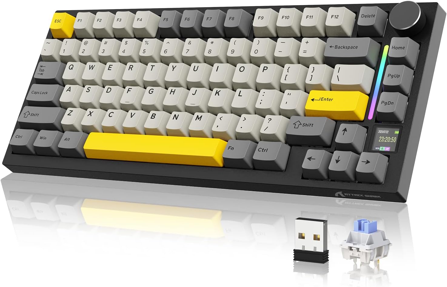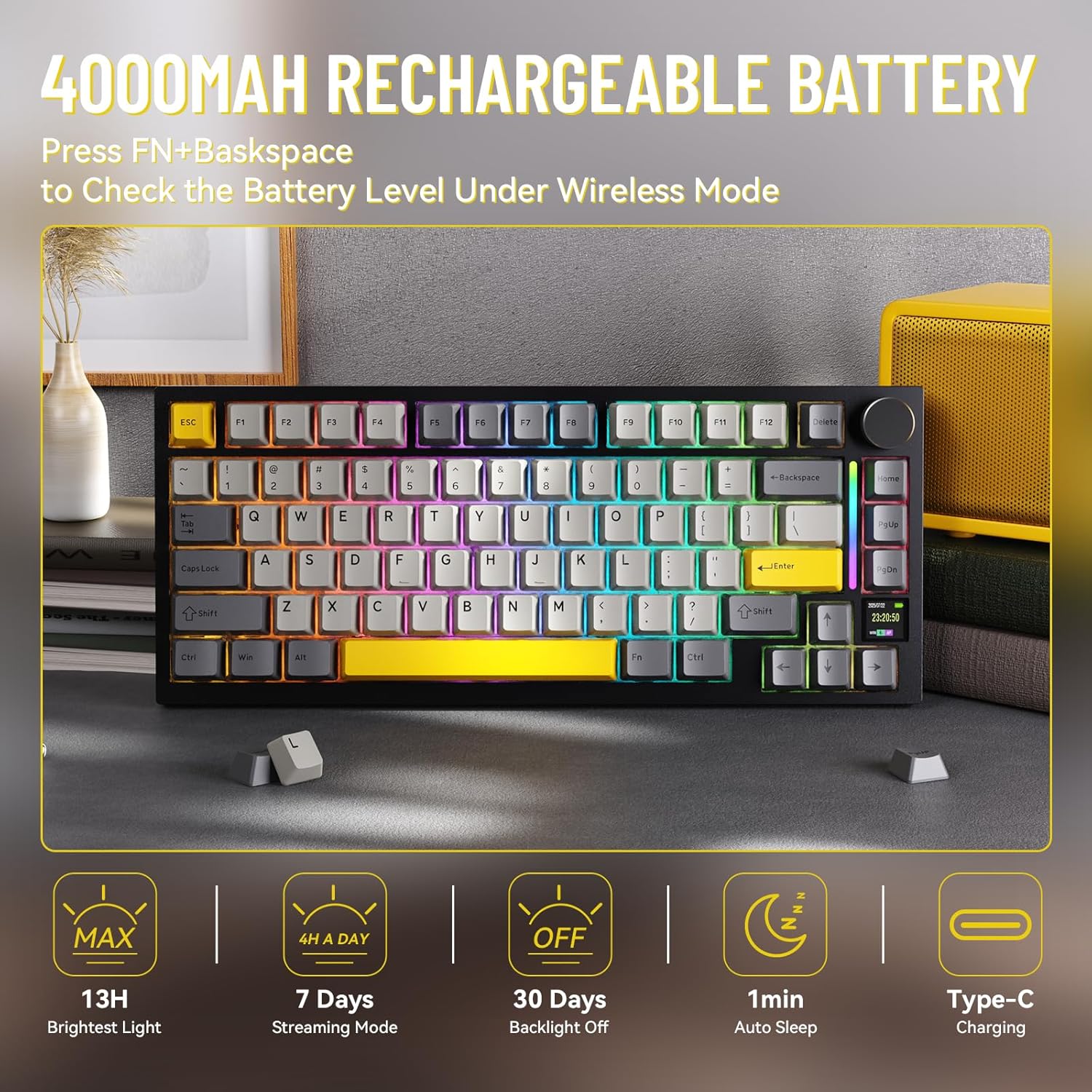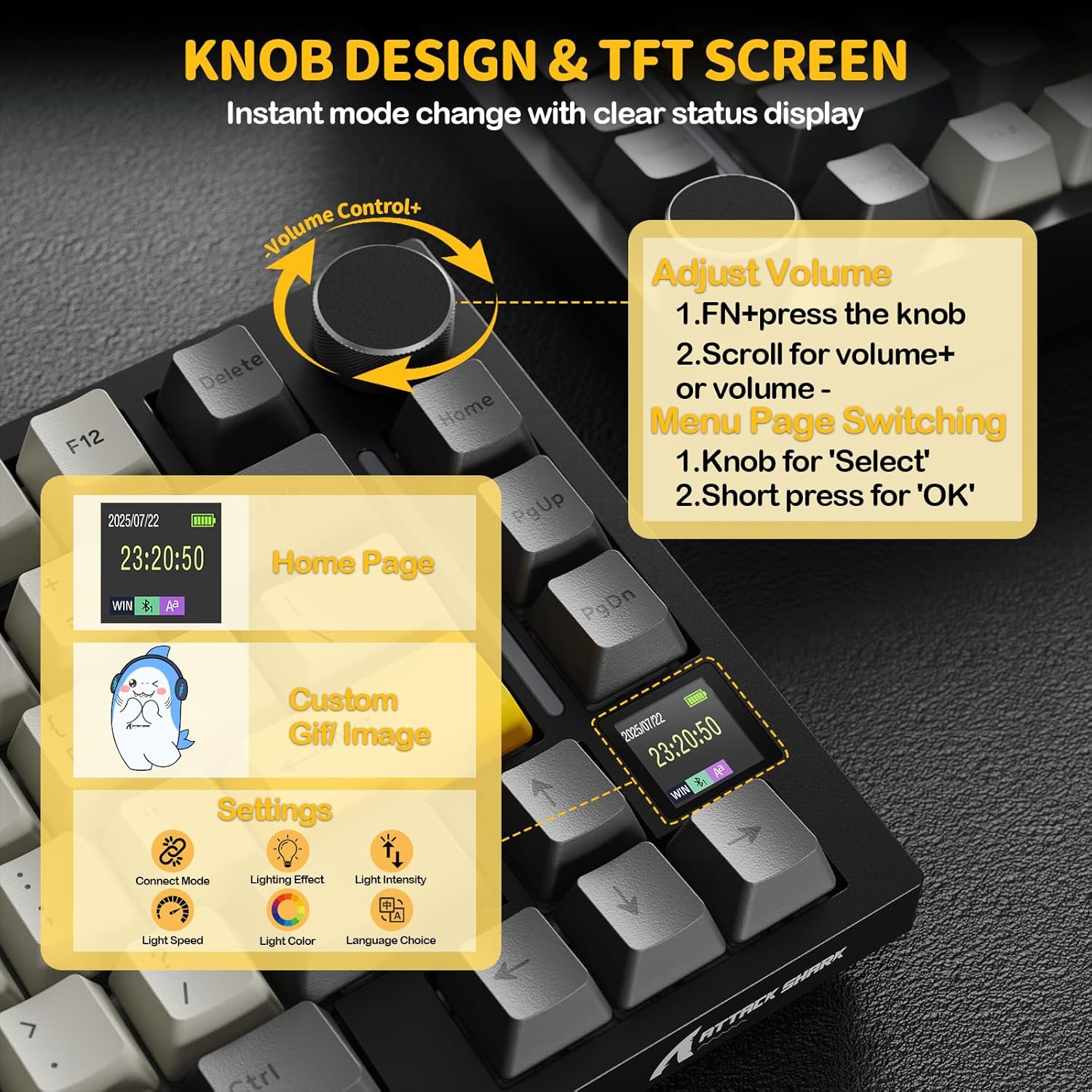 • 【75% ANSI оформление и дизайн на бутоните】Възползва се най-популярното 75% AINSI оформление с 81 клавиша, което го прави практичен избор за работа/игри. Лесно управление с вградения CNC алуминиев контрол на силата на звука. Завъртете го наляво/надясно, за да промените силата на звука, натиснете бутона, за да включите/изключите светлината. Също така регулирайте бутона поотделно.