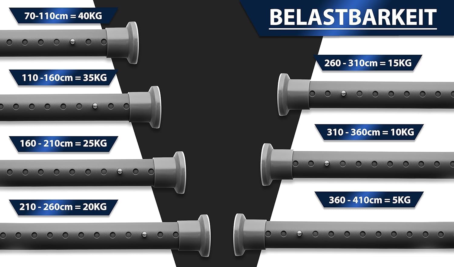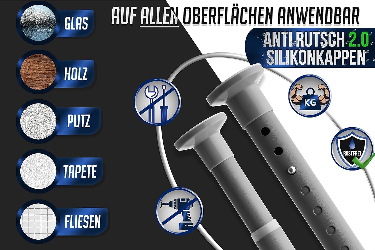 • Стабилност: Останете в безопасност с противоплъзгащи постелки 2.0 и превъзходна конструкция, която гарантира, че вашата завеса ще остане на мястото си на всяка повърхност. Нашият телескопичен прът е изработен от най-съвременни материали за максимална функционалност и издръжливост.