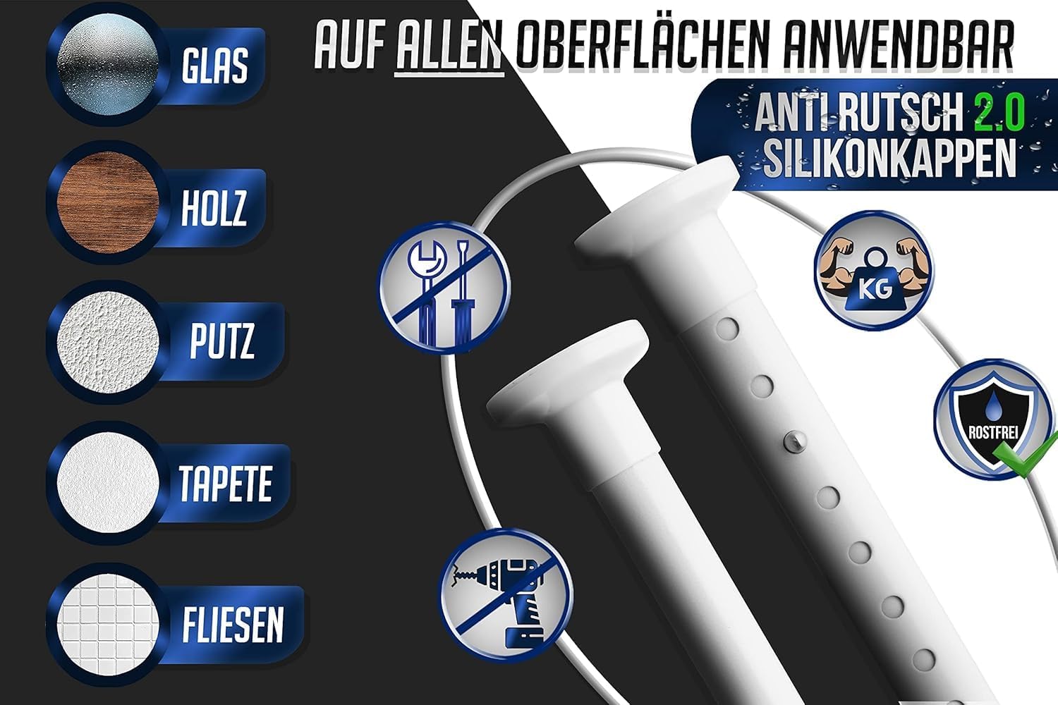 • Стабилност: Останете в безопасност с противоплъзгащи постелки 2.0 и превъзходна конструкция, която гарантира, че вашата завеса ще остане на мястото си на всяка повърхност. Нашият телескопичен прът е изработен от най-съвременни материали за максимална функционалност и издръжливост.