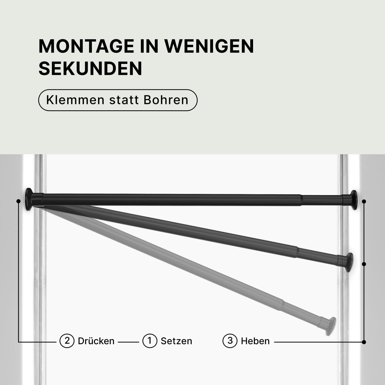• Лесен монтаж и универсално прилягане: трансформирайте всяка стая за минути с този регулируем прът за опъване без пробиване - не са необходими инструменти. Телескопичният прът за завеси се регулира безпроблемно до желаната дължина и гарантира перфектно прилягане навсякъде, от кухнята до банята. Изпитайте простотата на корниз за завеси без пробиване за бързи и безвредни обновявания.