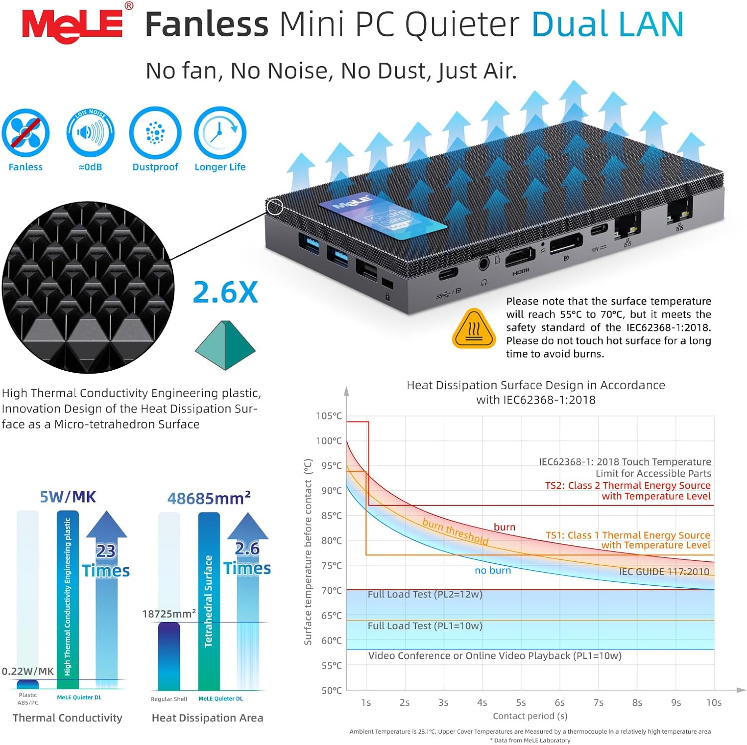MeLE QuieterDL безвентилаторен мини компютър 2.5Gb двоен LAN Alder Lake N100 (до 3.4GHz) 16GB DDR4 512GB ROM офис микро компютър USB-C HDMI 2.0+DP1.4 настолен компютър с три екрана