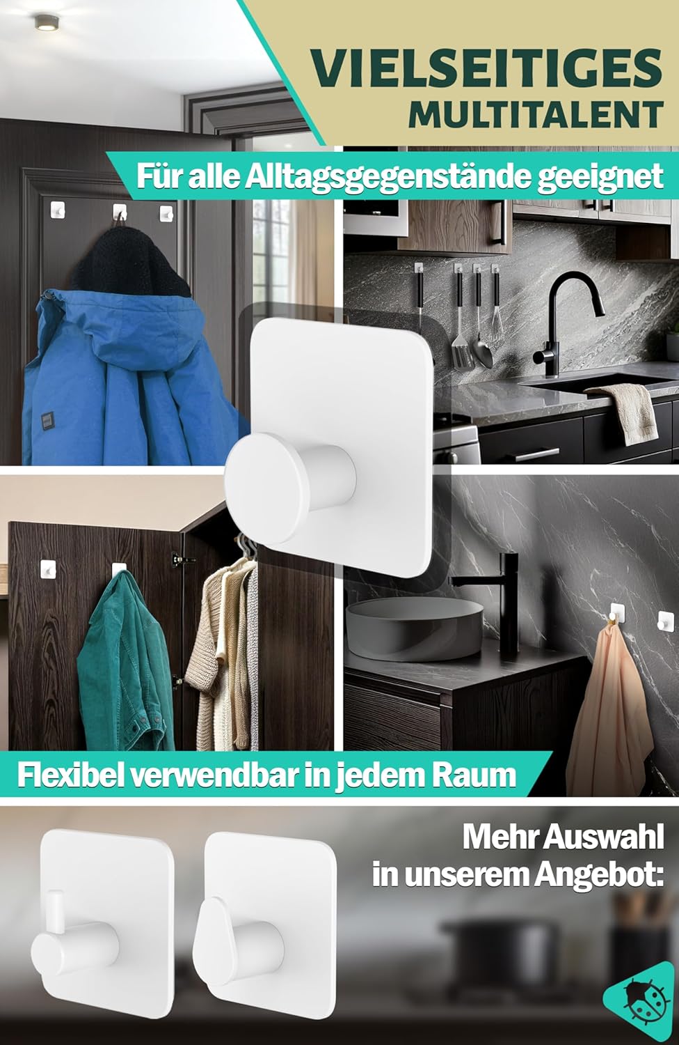 • Многофункционални: 6 самозалепващи се куки от неръждаема стомана, идеални за закачане на палта, кухненски държачи за кърпи, както и закачане на кърпи без пробиване на врати, шкафове във всички стаи - наистина задължителни за първия апартамент