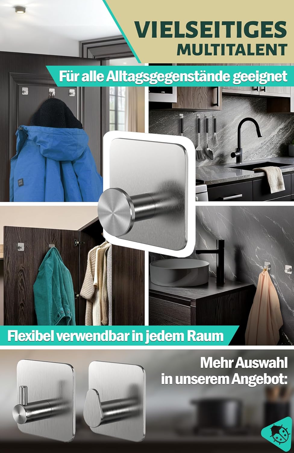 • Многофункционални: 6 самозалепващи се куки от неръждаема стомана, идеални за закачане на палта, кухненски държачи за кърпи, както и закачане на кърпи без пробиване на врати, шкафове във всички стаи - наистина задължителни за първия апартамент