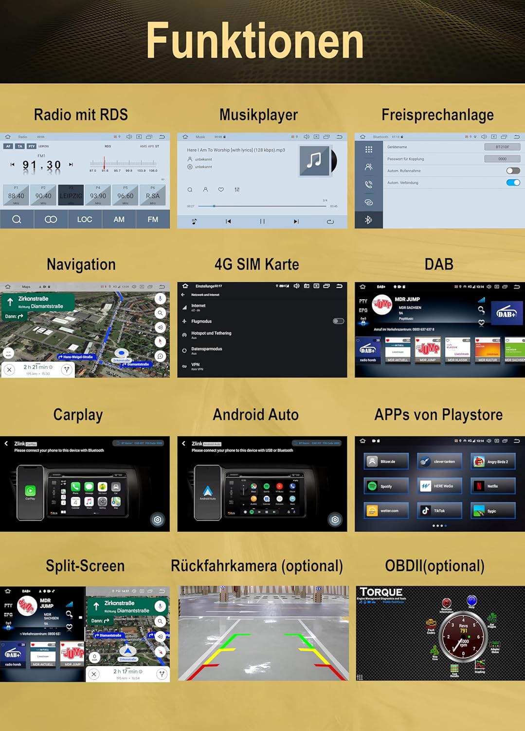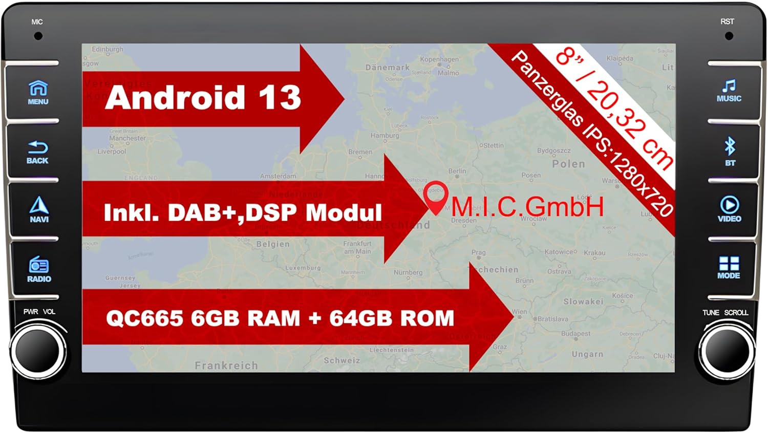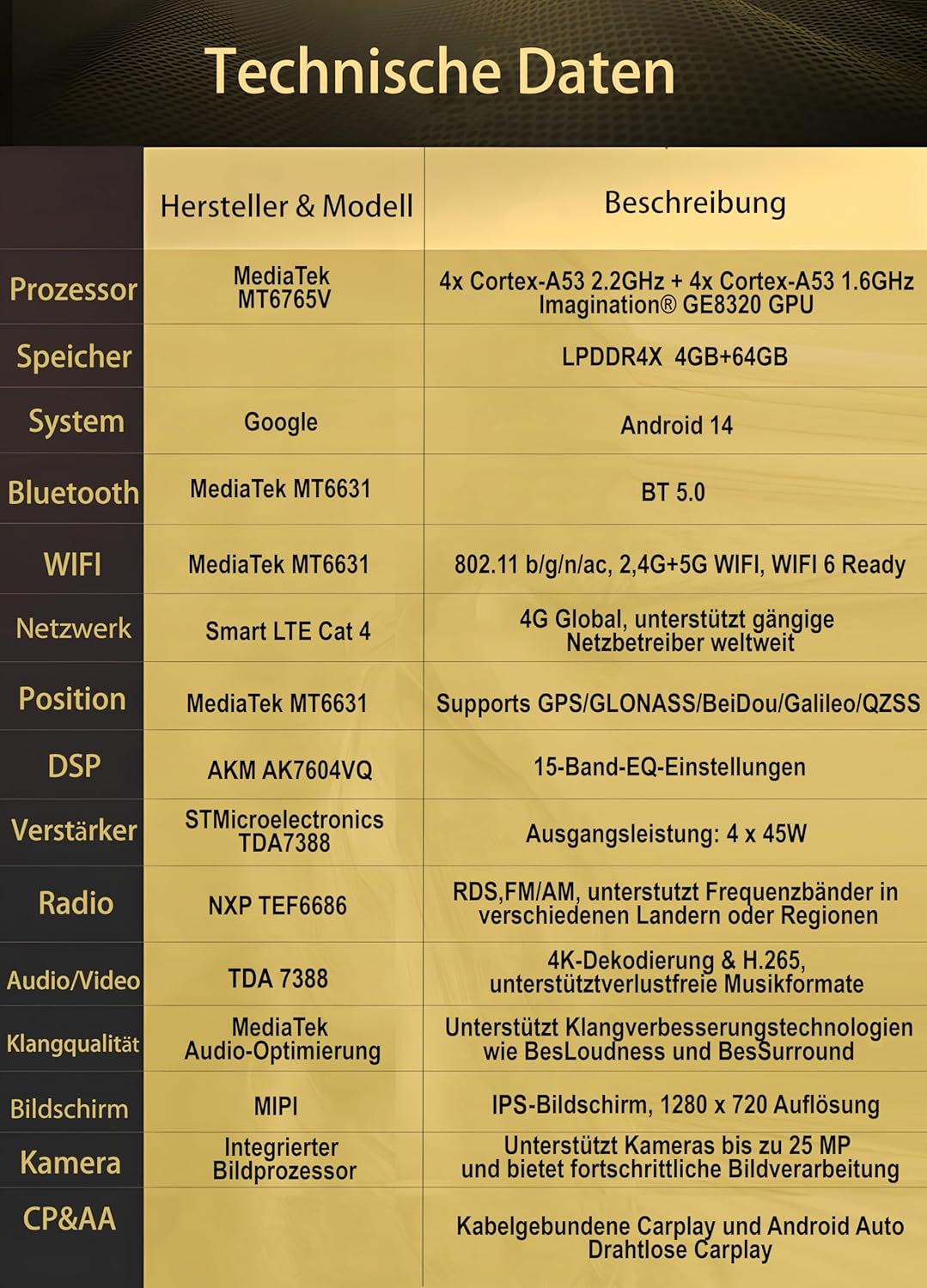 Processor: PX30 / Quad Cortex-A53 memory: 2GB RAM Internal Memory: 32GB OS: Android 10.0 Display: IPS display with multi-touch screen 1280 x 720 HD display, multi-point capacity, touch screen audio: TDA 7851 Module Supported Functions: Wi-Fi, steering wheel remote control, reversing camera, external microphone, brightness control, RDS, TV, etc. USB/mSD Card: 2 x USB 2.0 standard transmission max. up to 1 TB, can be separated as desired. 2 x Micro SD Card Slot Max. 32GB Bluetooth: BT 5.0 A2DP music with track and phone book can be synchronised. Video decoding: Supports RMVB, MKV, MOV, WMV, AVI, MPG, TS with 1080P H.264 format and much more. Network connection: Support 3G dongles (WCDMA/CDMA2000), WiFi dongles or 3G hotspot from your smartphone update function: Regular updates via mSD card or USB navigation software: Europe offline maps with TTS and traffic information (internet). Support various software, also 3D maps possible working temperature: -20 - 70 degrees Celsius