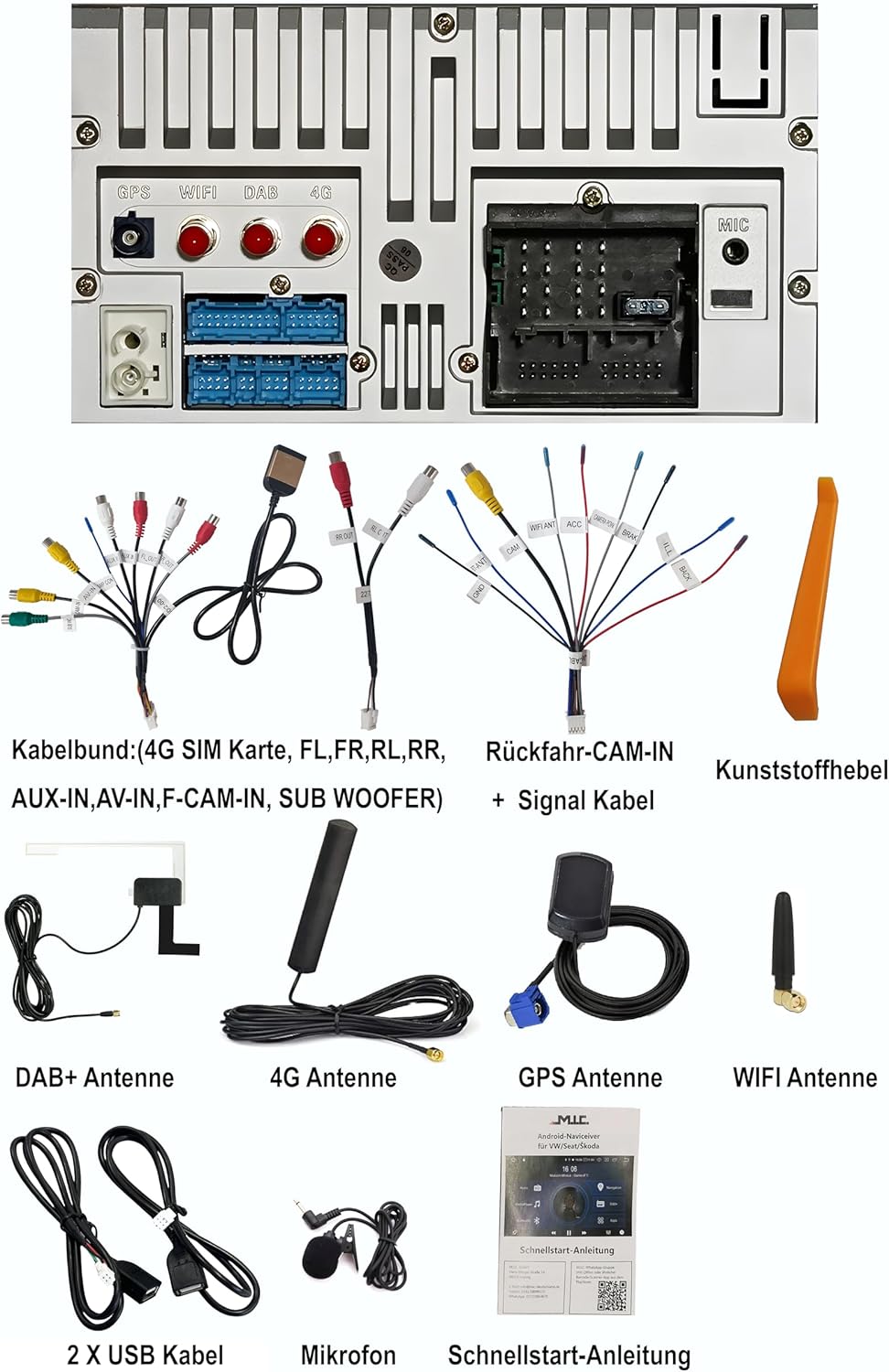 1x MIC AV8V6-Lite 1x double USB cable, 1x DAB+ antenna, 1x GPS antenna, 1x WiFi antenna, 1x cable bundle (rear view camera, ACC, etc.)