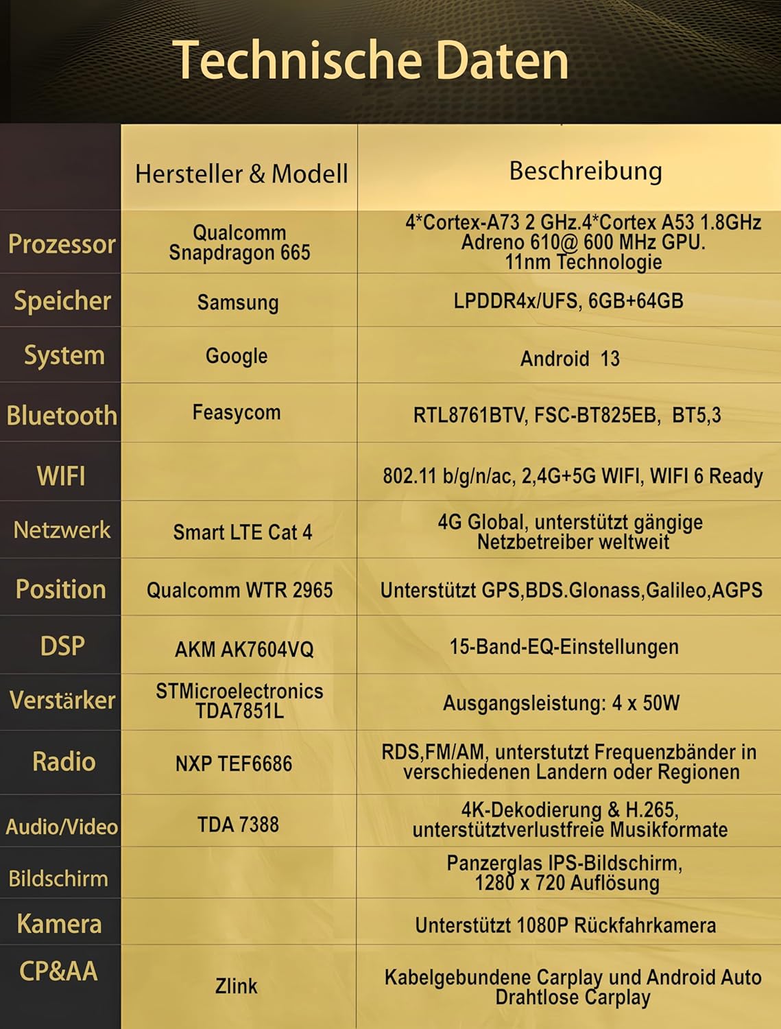 Processor: PX30 / Quad Cortex-A53 memory: 2GB RAM Internal Memory: 32GB OS: Android 10.0 Display: IPS display with multi-touch screen 1280 x 720 HD display, multi-point capacity, touch screen audio: TDA 7851 Module Supported Functions: Wi-Fi, steering wheel remote control, reversing camera, external microphone, brightness control, RDS, TV, etc. USB/mSD Card: 2 x USB 2.0 standard transmission max. up to 1 TB, can be separated as desired. 2 x Micro SD Card Slot Max. 32GB Bluetooth: BT 5.0 A2DP music with track and phone book can be synchronised. Video decoding: Supports RMVB, MKV, MOV, WMV, AVI, MPG, TS with 1080P H.264 format and much more. Network connection: Support 3G dongles (WCDMA/CDMA2000), WiFi dongles or 3G hotspot from your smartphone update function: Regular updates via mSD card or USB navigation software: Europe offline maps with TTS and traffic information (internet). Support various software, also 3D maps possible working temperature: -20 - 70 degrees Celsius