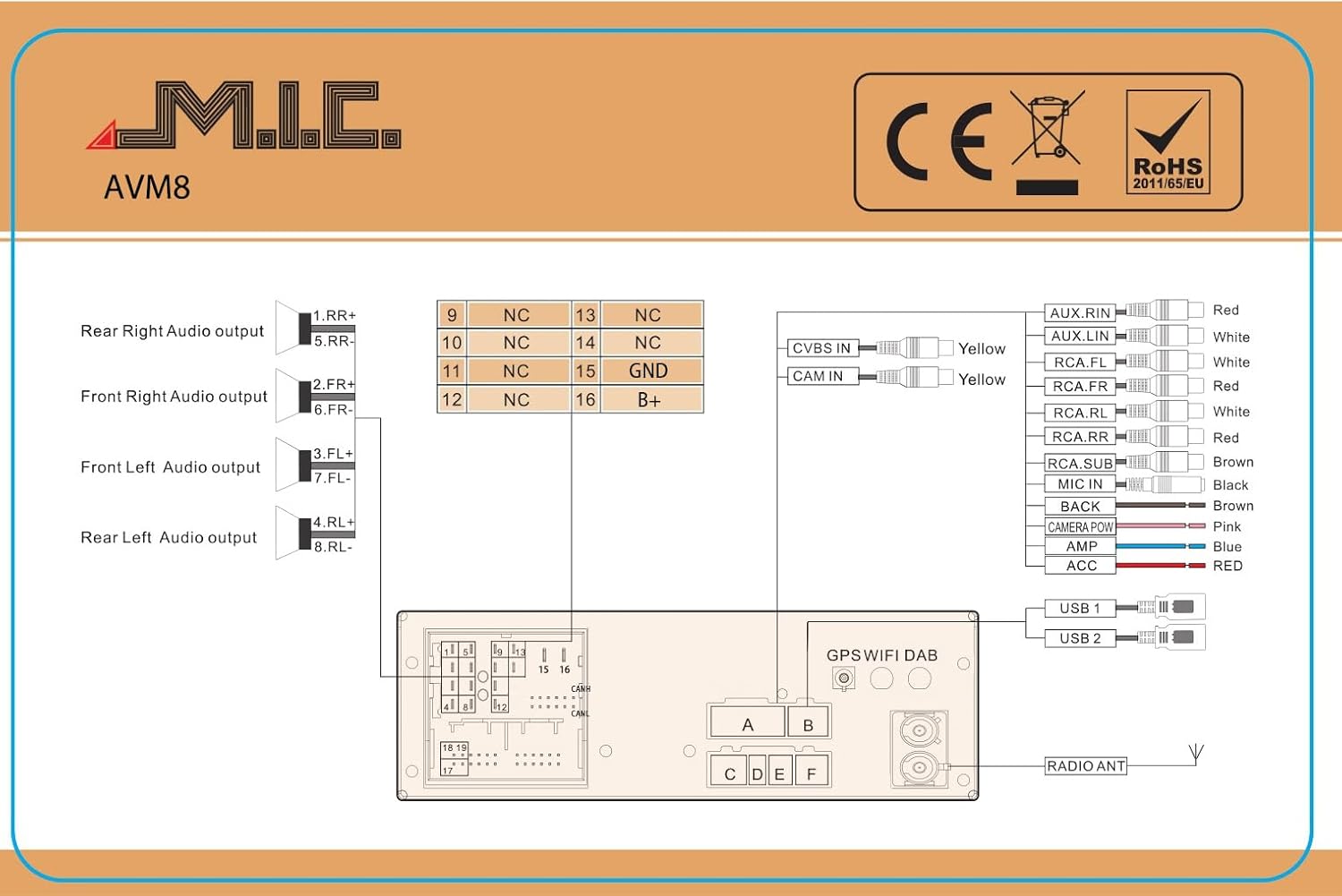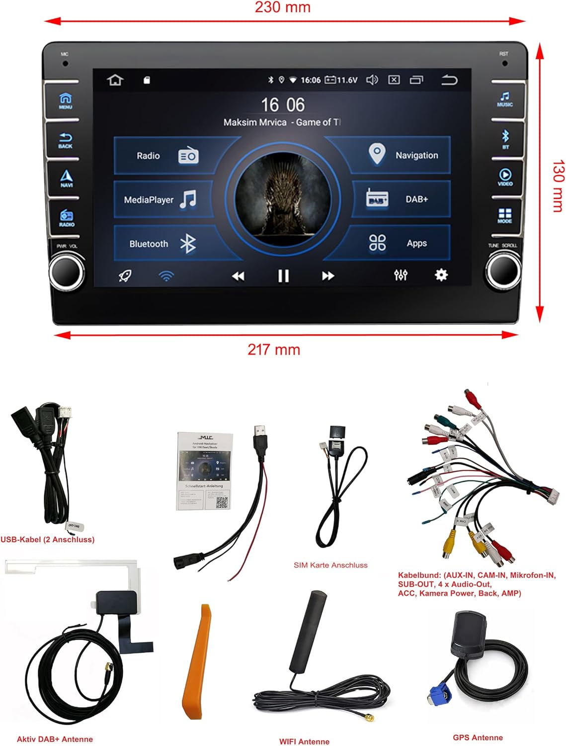 1x MIC AV8V6-Lite 1x double USB cable, 1x DAB+ antenna, 1x GPS antenna, 1x WiFi antenna, 1x cable bundle (rear view camera, ACC, etc.)