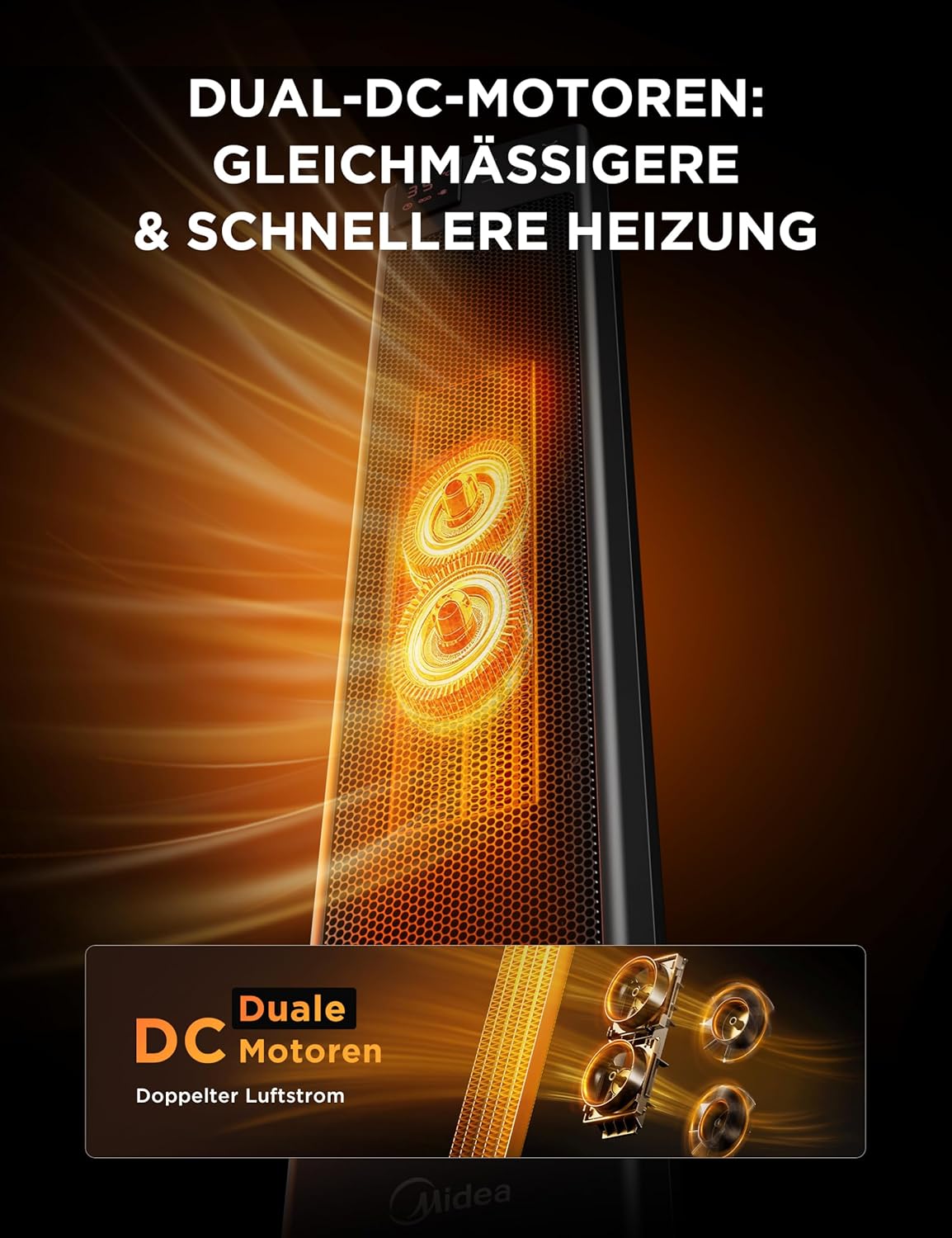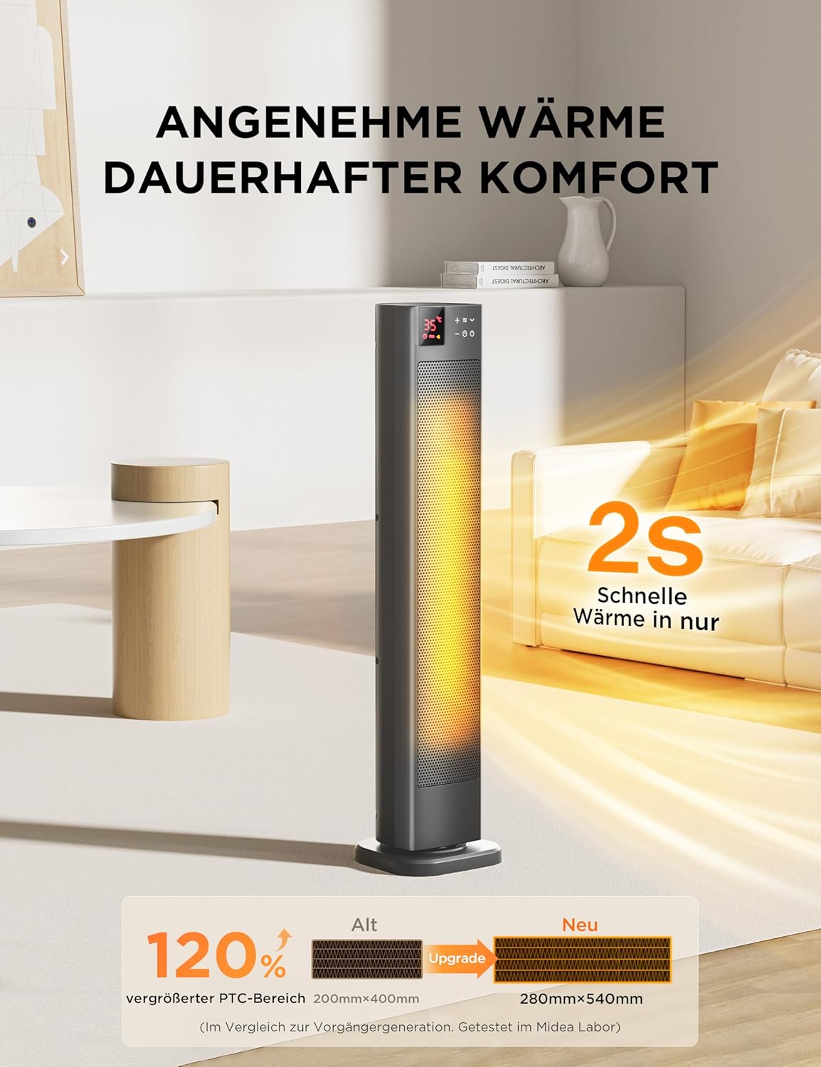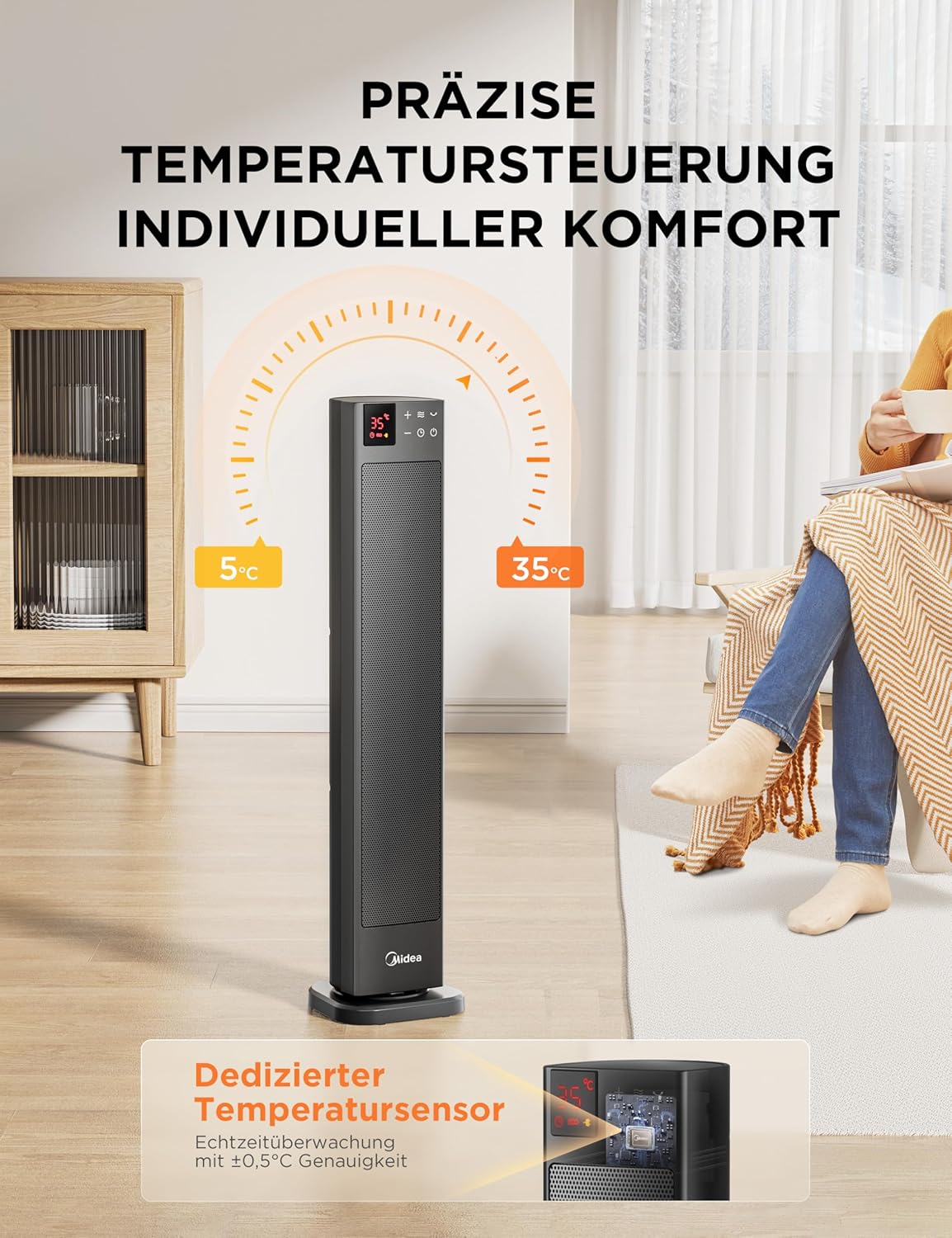 Midea NTH20-22GR(GR) Електрически керамичен нагревател 2000 W с термостат и дистанционно управление, 76 см, 3 режима, 24-часов таймер, защита от прегряване и накланяне, моментално затопляне за офис/спалня